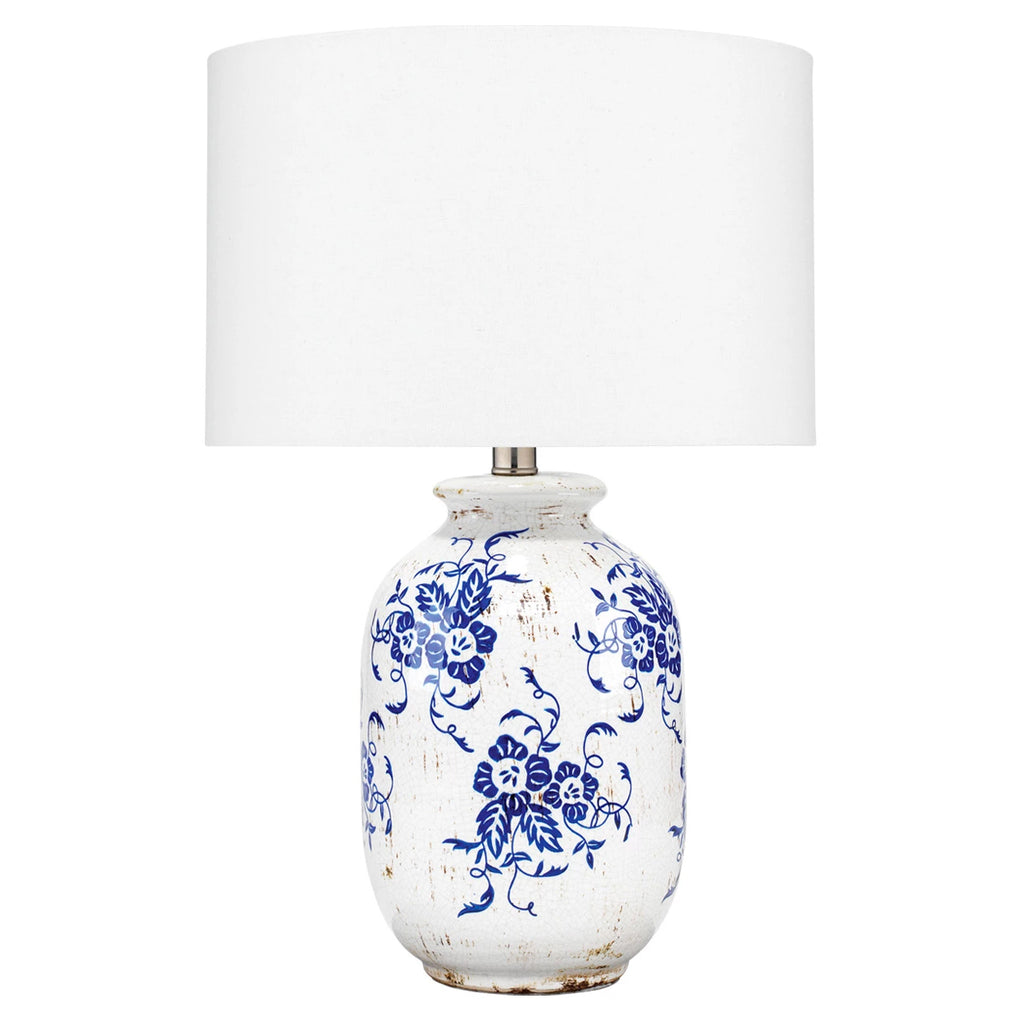 Add antique character to your home with this table lamp. Beautifully crafted of ceramic, its base features a vintage floral pattern and distressed-white finish that offers a timeworn feel. Balanced with a cotton shade, this accent is perfect for any setting.