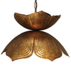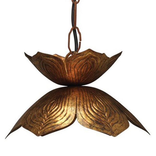 Shimmering and grand, this pendant light features a blooming lotus design that creates a stunning statement. Made of metal and finished in a rich, antique gold that gleams when illuminated.