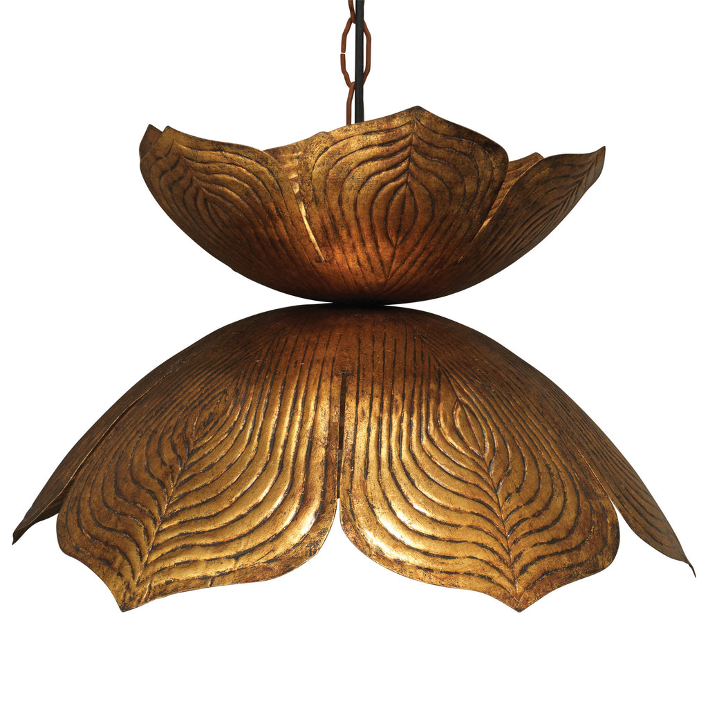 Shimmering and grand, this pendant light features a blooming lotus design that creates a stunning statement. Made of metal and finished in a rich, antique gold that gleams when illuminated.
