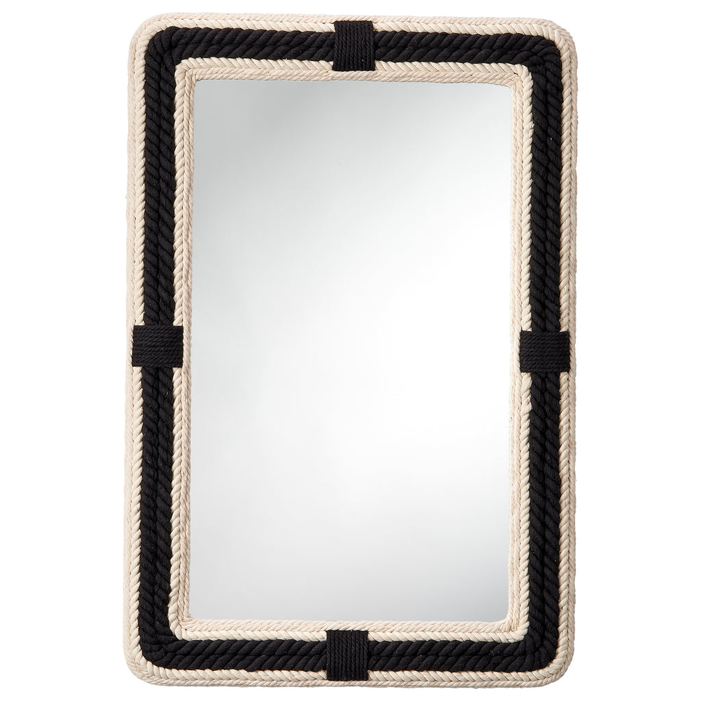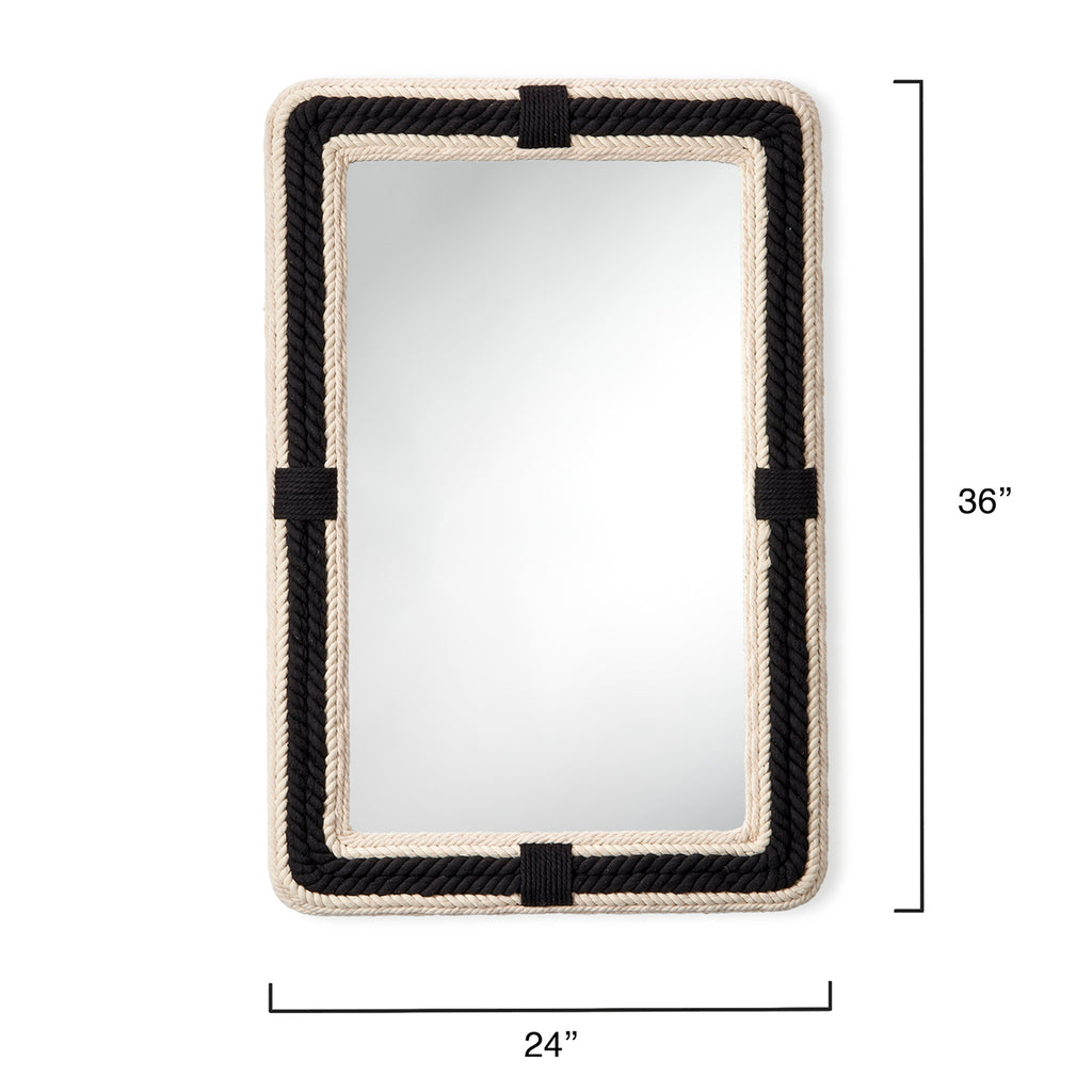 We add a little French chic to a classically nautical look to create this jaunty wall mirror. The frame is intricately braided cotton-jute rope, with rows of black and off-white that contrast stylishly.