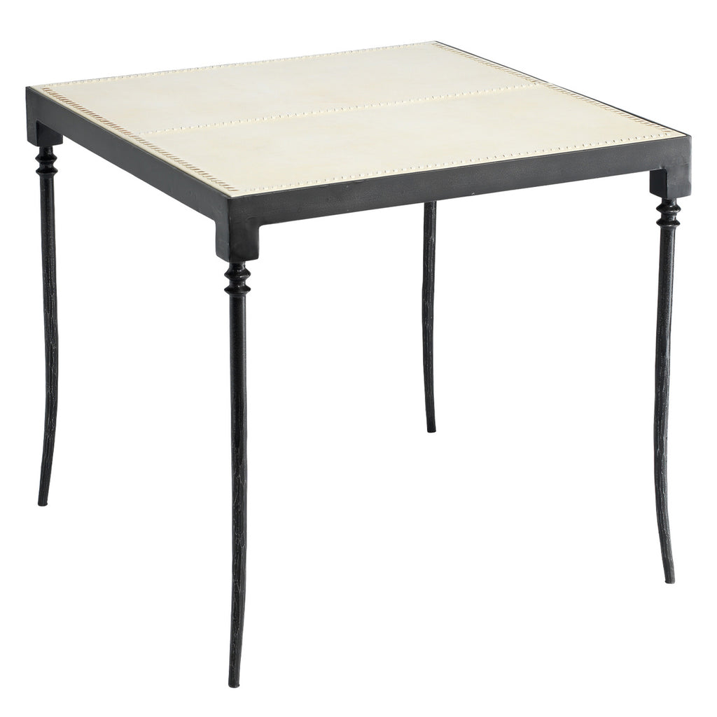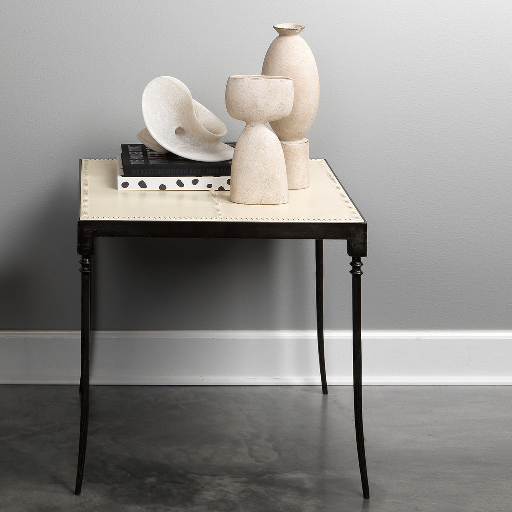 Off-white leather contrasts boldly with hand-forged iron legs in this artisan crafted accent table. The sabered legs and visible stitching add interest. Pair with our Abilene, Sweetwater, or Asher Chair for a unpredictable and stylish grouping.