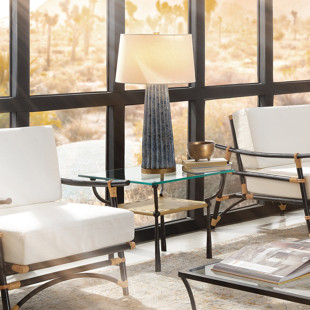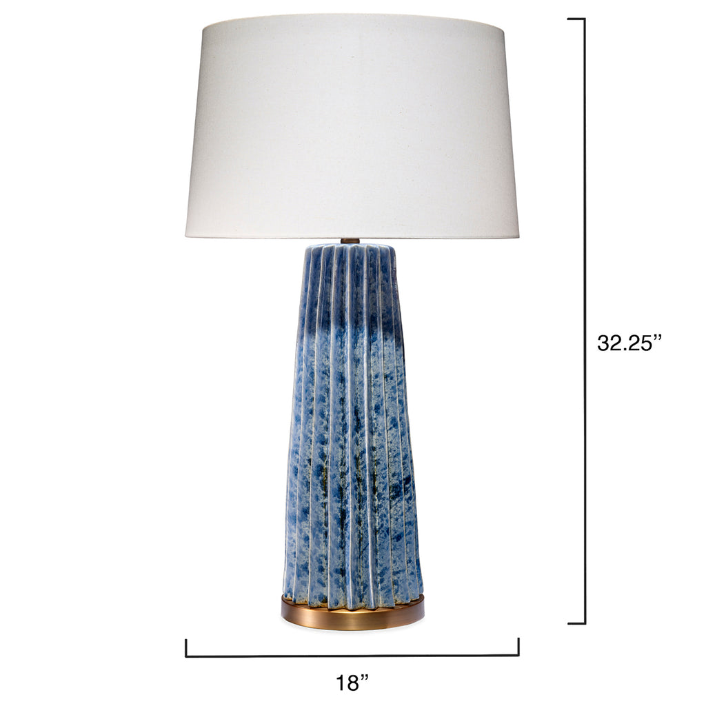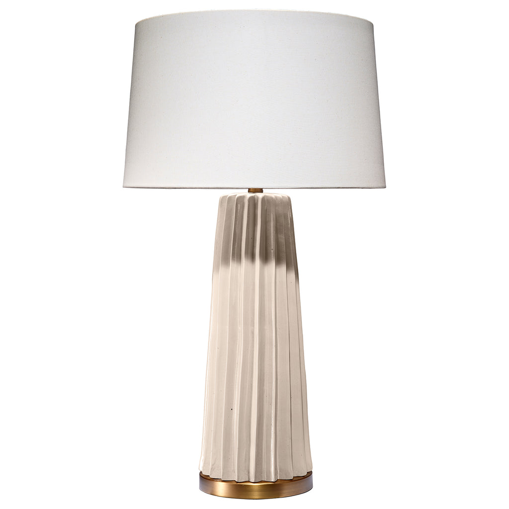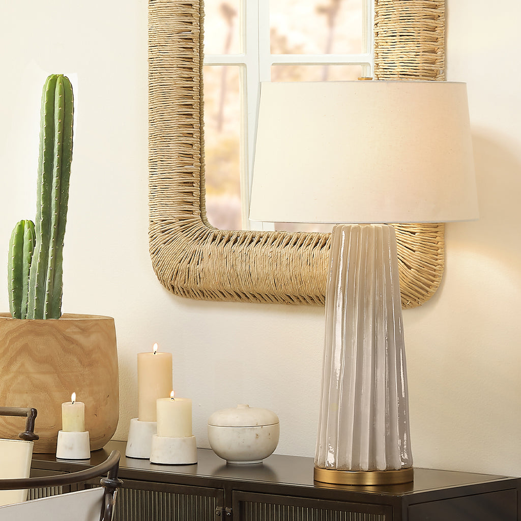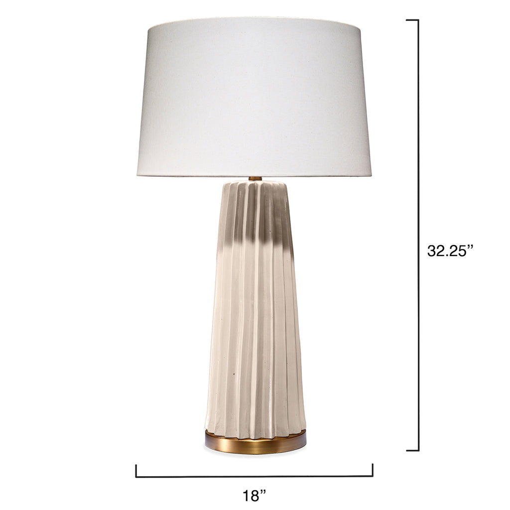 The simple lines of this handcrafted ceramic lamp are elevated with a unique pleated effect inspired by Japanese streetwear. Keep the fashion-forward look sleek with the addition of the tapered, rolled edge linen shade. A metal base and trapezoid finial add the final flourish. Display singly or in pairs anyway that needs a touch of extra illumination! At once modern and timeless, this is a look that will always be in style.