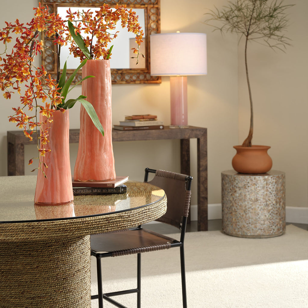 Expertly handcrafted of colored glass, the shape and nuanced details of this tall vase masterfully evoke the majesty of a single strong sequoia tree. Tall and slim, it is ideal for use with long stemmed florals.