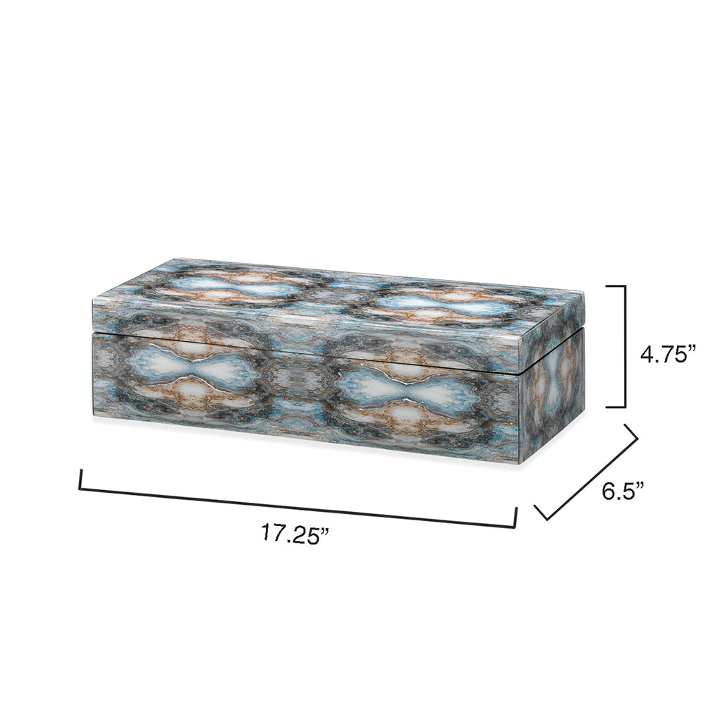 Inspired by Rorschach inkblots tests, known to examine emotion through interpretation, our Rorschach Long box inspires you to look closer into the bold tones of indigo, navy and cream, accented with silver and gold leaf. These components create dynamic patterns through overlaid photos underneath a clear lacquer.