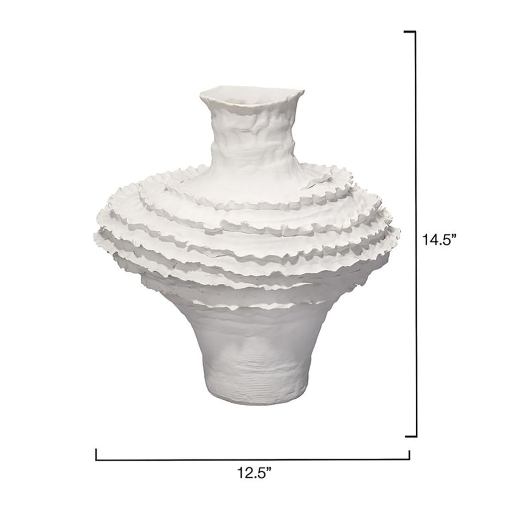 The lines of this evocative vase are open to interpretation.  Do you see mounds of freshly whipped cream, a ruffly lace petticoat, or dramatic layers of clouds in an otherwise blue sky?  No matter how it speaks to you, each of these watertight vessels is expertly artisan crafted of matte white ceramic. Whether you choose to customize it with your favorite filler or simply display it, it is certain to delight your family and friends.