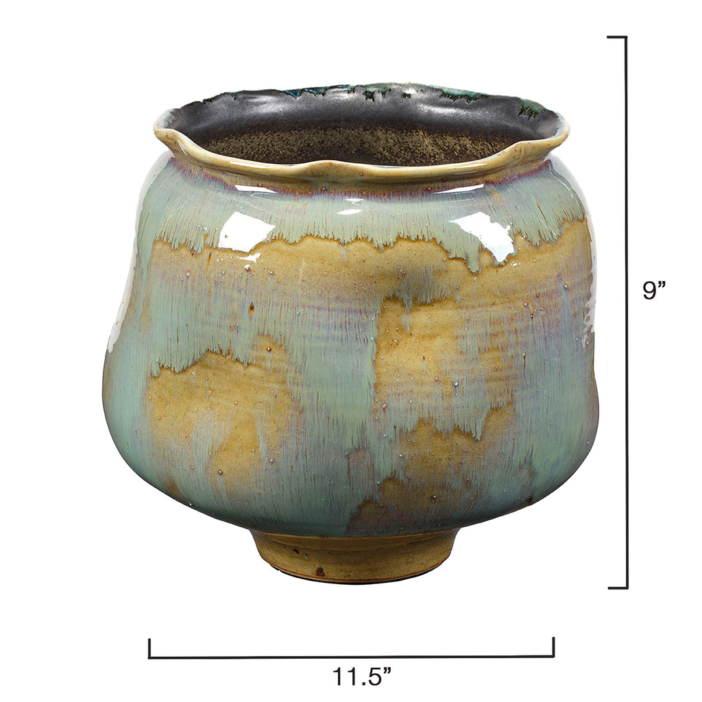 Individually crafted by master artisans, each of these ceramic vessels features softly rounded and dimpled shapes. Layers of blue, natural, and purple glazes are applied using a technique that reacts uniquely on each piece, ensuring that no two are completely identical. Their warmth and beauty complement a variety of fillers—try similar shades like feathers and reeds, or add brighter contrasting colors like florals and greenery.