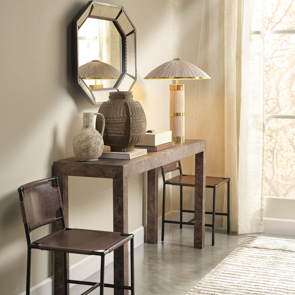 Inspired by Jamie’s time in Asia, these artisan-crafted table lamps bring the beauty of those landscapes to your interiors. Here, she pairs the organic nature of whitewashed rattan with the luxe look of gleaming polished brass, topped with a coordinating, brass-trimmed dome shade. The finishes contrast strikingly, resulting in a timeless look to help you create your own at-home oasis.