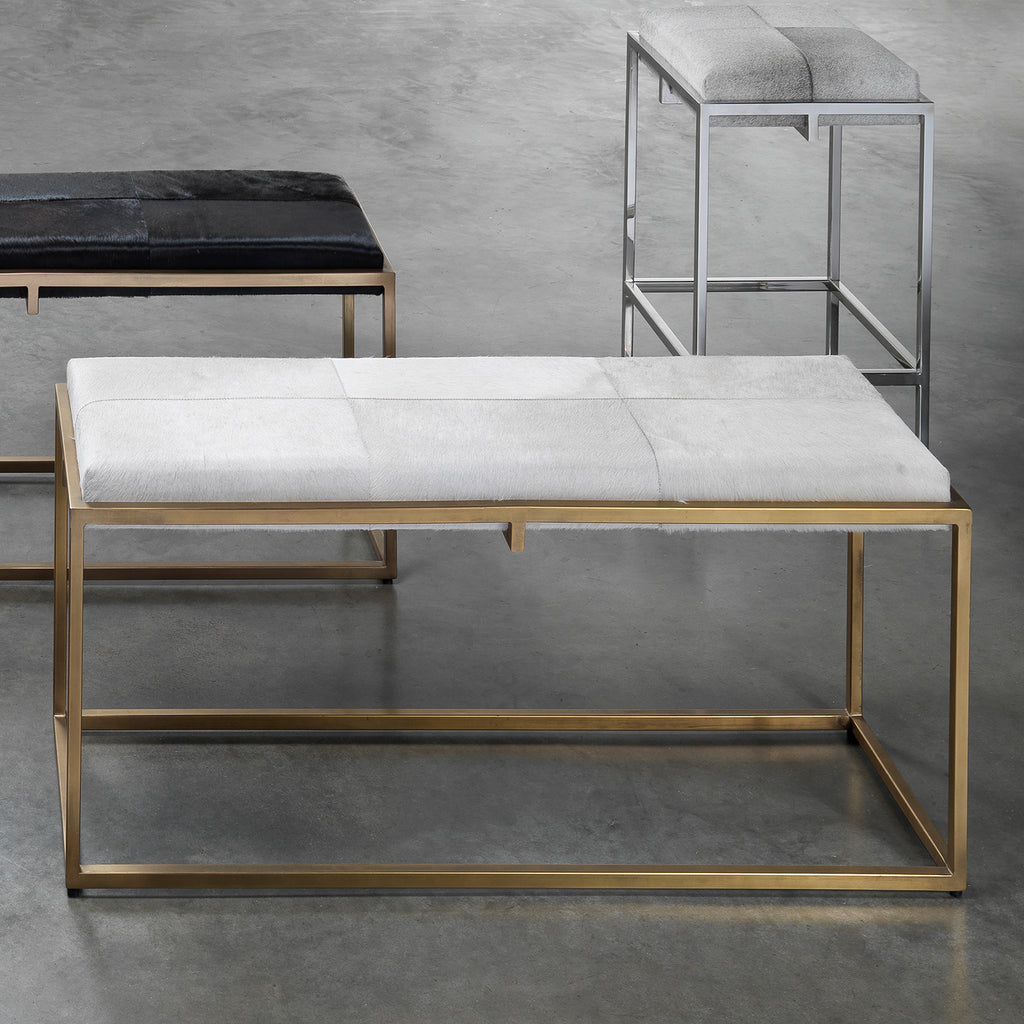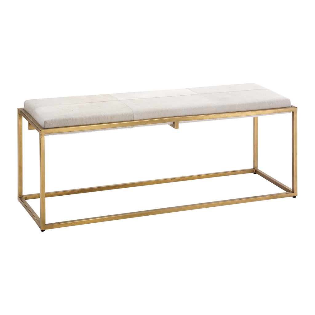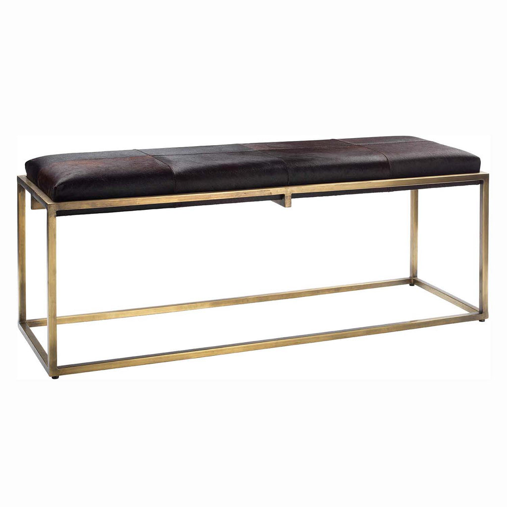 A gorgeous endpiece to add at the end of your bedframe or along the wall of an entryway. The Jamie Young Shelby Bench features an open design with a metal frame and luxuriously soft hide cushion. Antique brass is paired here with rich chocolate brown or white tones to create an alluring feel.