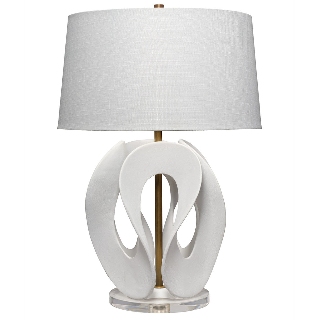 Soft swirls of pure resin dance around the base of this exquisite table lamp, suggesting the majestic curve of a swan’s silhouette. A wonderful choice for a coastally inspired decor, the clean palette is continued with a linen drum shade and warmed with antiqued brass hardware. A simple circle in clear acrylic provides an anchor, subtly reflecting the water the birds call home.
