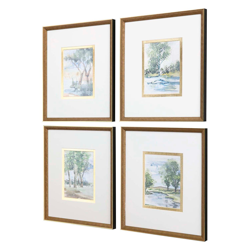 Exclusive hand embellished giclee with gold leaf matting. Framed in an antique gold wood with embossed weave pattern. Sold as set of four.