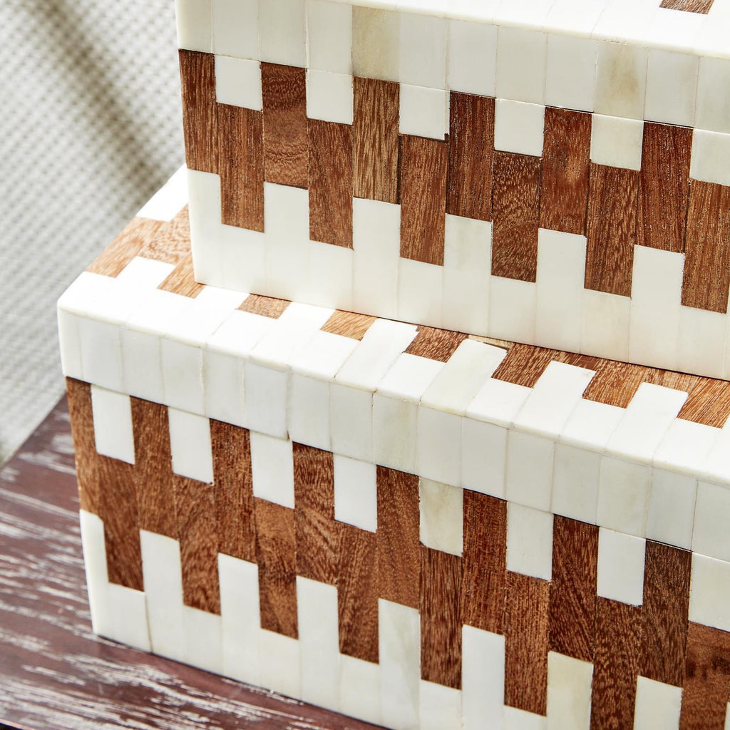 Transform your space with this set of two charming jigsaw covered boxes, exquisitely crafted with a wood finish interior. Each box, meticulously constructed from MDF, bone, and acacia wood, adds a touch of elegance to any room. Perfect for storing trinkets or displaying as standalone pieces, these boxes are as functional as they are stylish.
