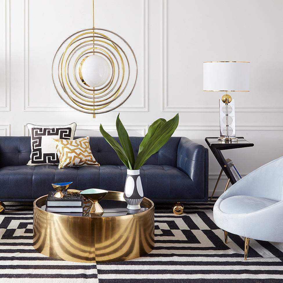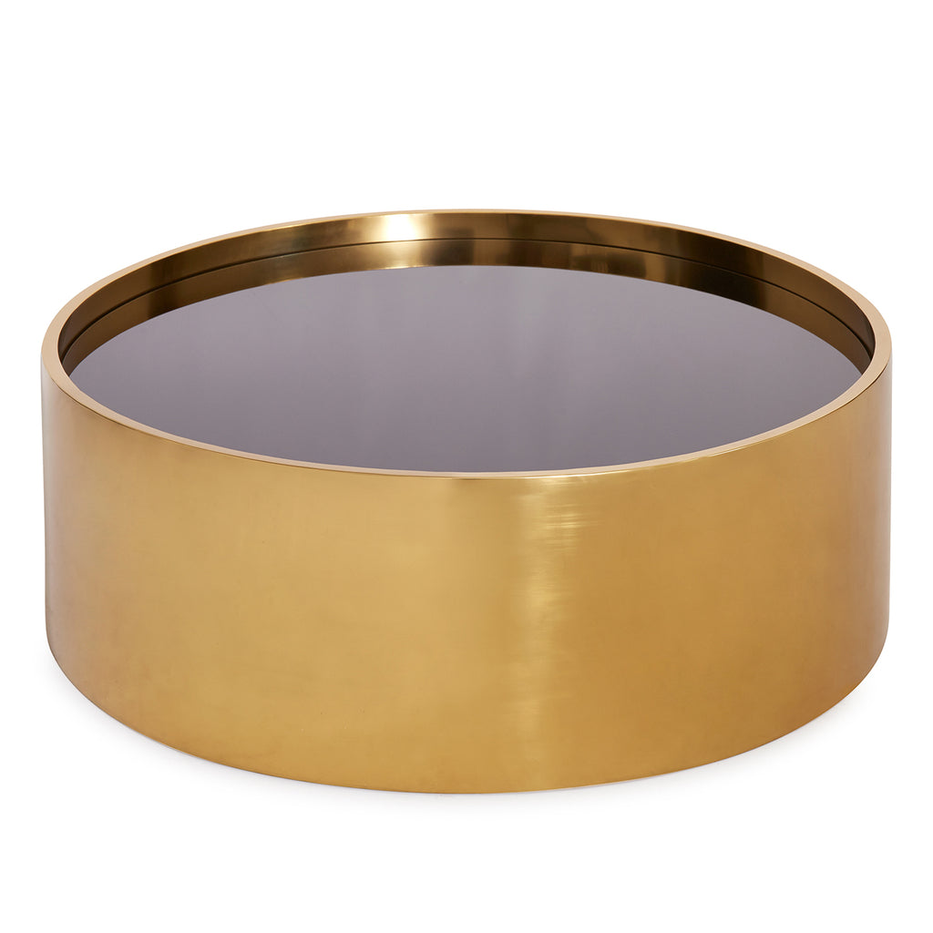 Minimalist and modern, the Jonathan Adler Alphaville Cocktail Table is available in polished stainless steel with a smoke mirror top or honed brass with a black glass top. The simple drum form is a solid anchor for any room, while the reflective surface keeps the feeling light and glamorous. An ideal complement to leggy sofas and chairs.