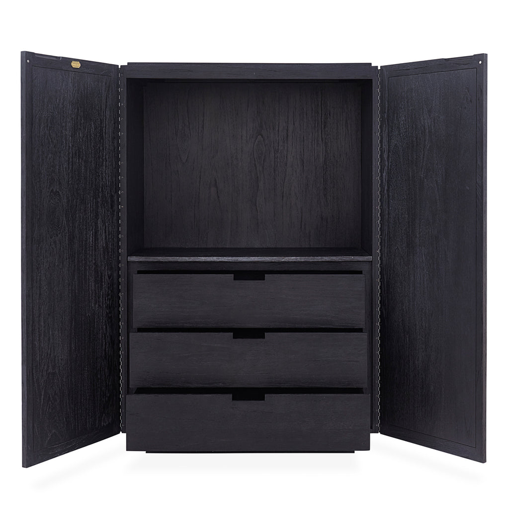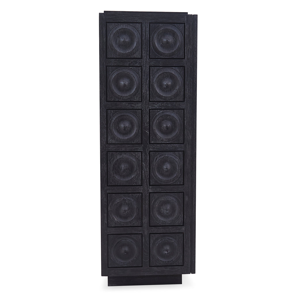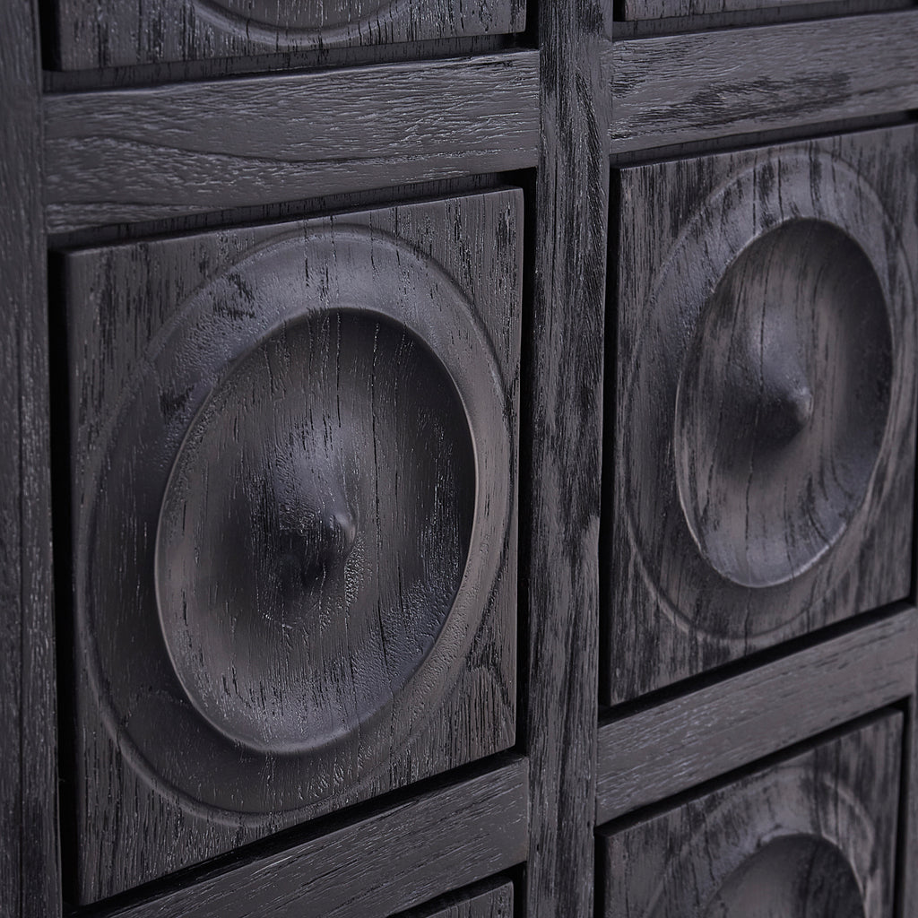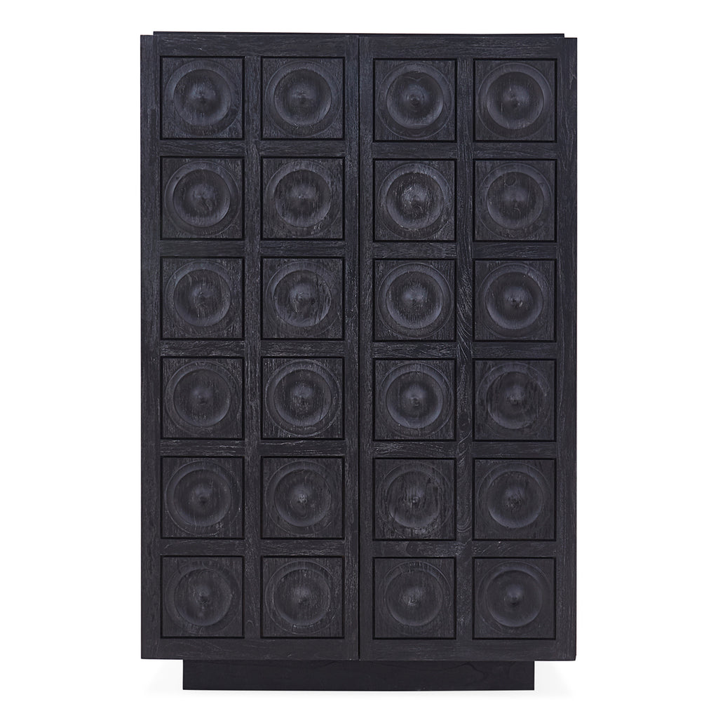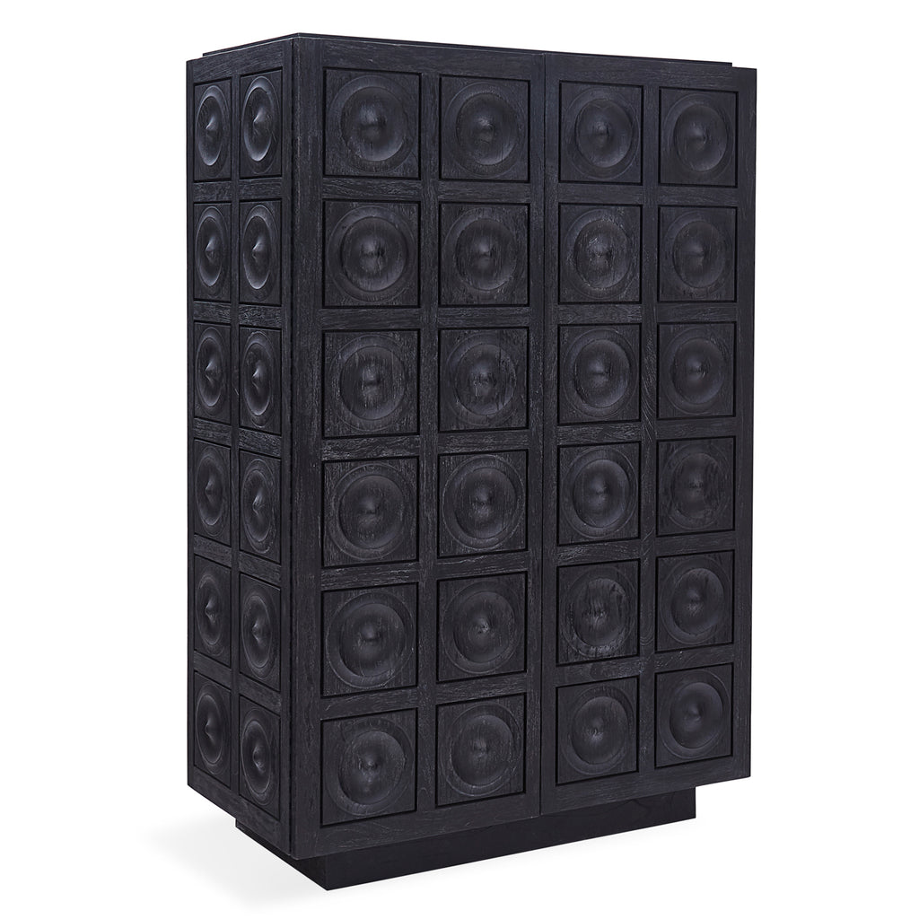 An ebonized and limed mindi wood Jonathan Adler cabinet faced with solid mindi circle tiles. Featuring hidden pulls and an interior fitted with three self-closing drawers and an adjustable shelf. Familiar but fresh, our Antwerp Circles Cabinet is the kind of piece you fantasize about stumbling upon at Paris' Marché aux Puces. Think French '50s limed furniture reimagined for the 21st century. Hardworking, chic, and durable, it’s a sublime addition to your entryway or dining room.