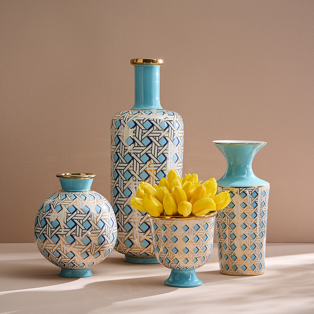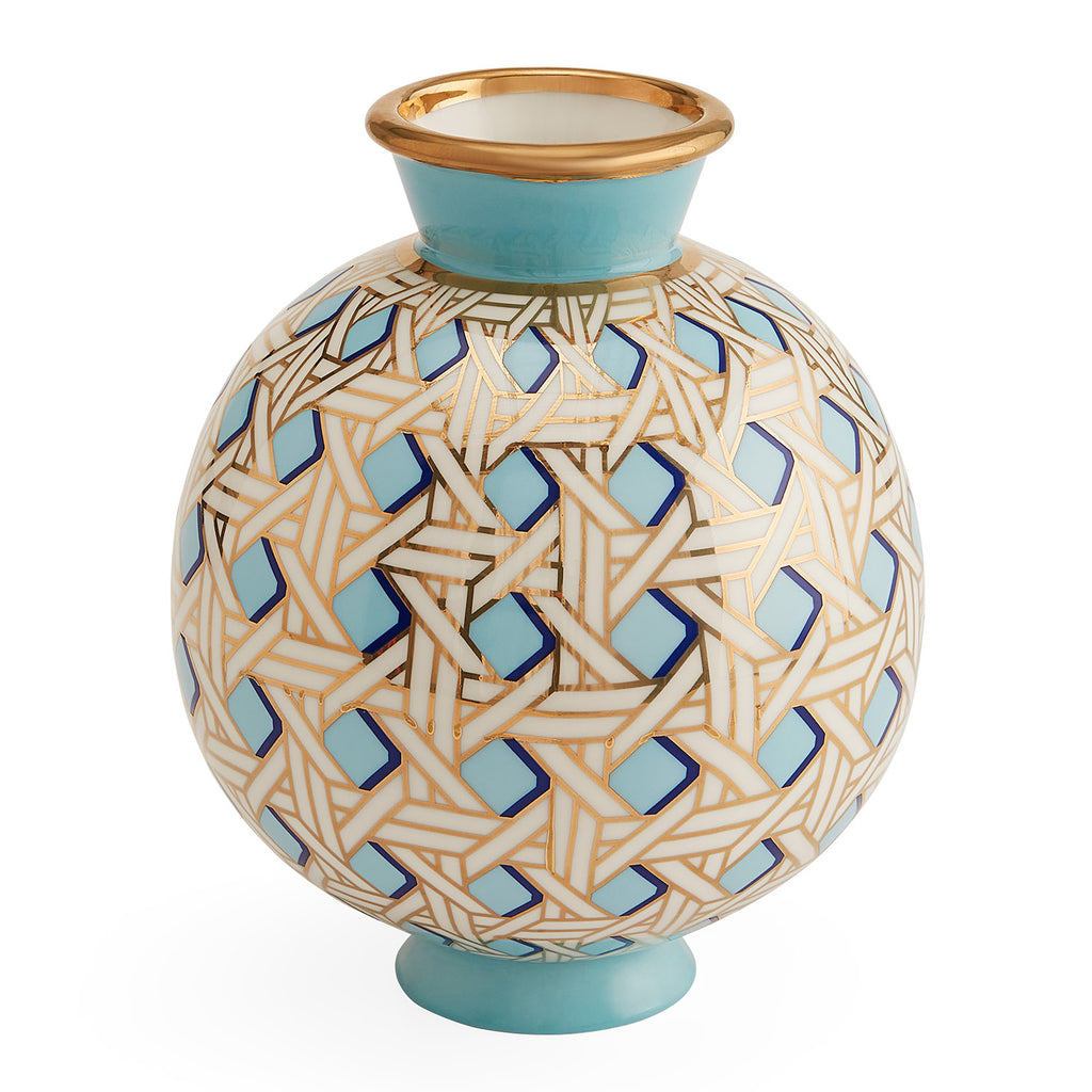 The preppy print your tablescape needs. Porcelain vessels crafted from high-fired porcelain and glazed in fresh light blue wrapped in classic, glimmering gold Palm Beach caning. Our Basketweave vases are just the punchy yet polished jolt of color and pattern your world has been waiting for.