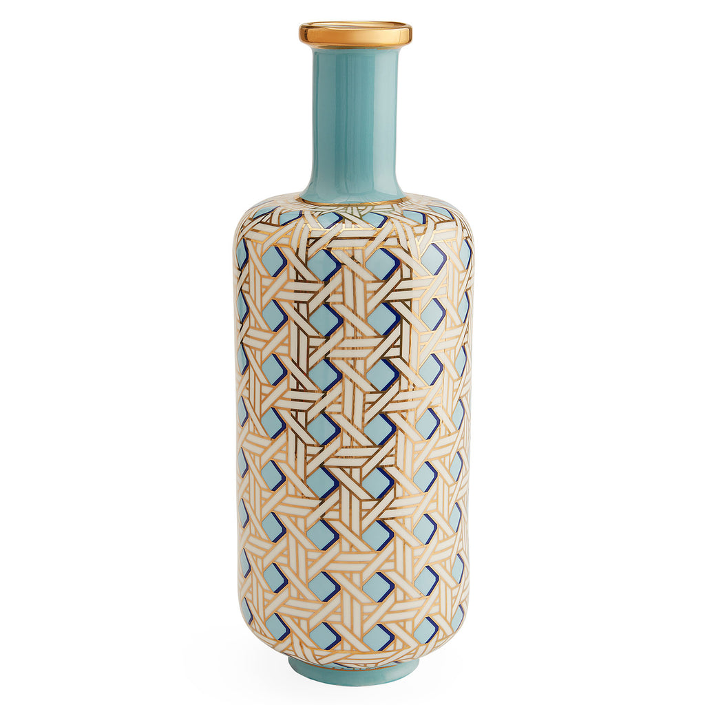 The preppy print your tablescape needs. Porcelain vessels crafted from high-fired porcelain and glazed in fresh light blue wrapped in classic, glimmering gold Palm Beach caning. Our Basketweave vases are just the punchy yet polished jolt of color and pattern your world has been waiting for.