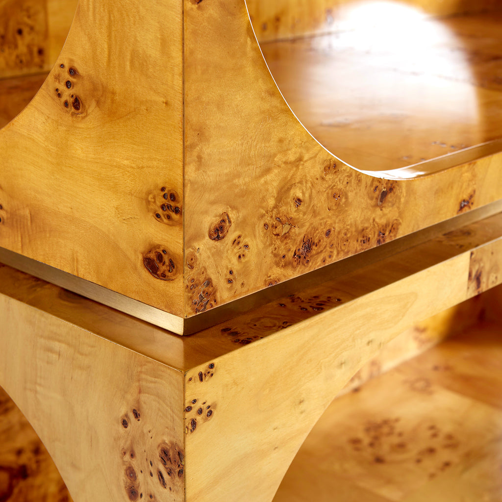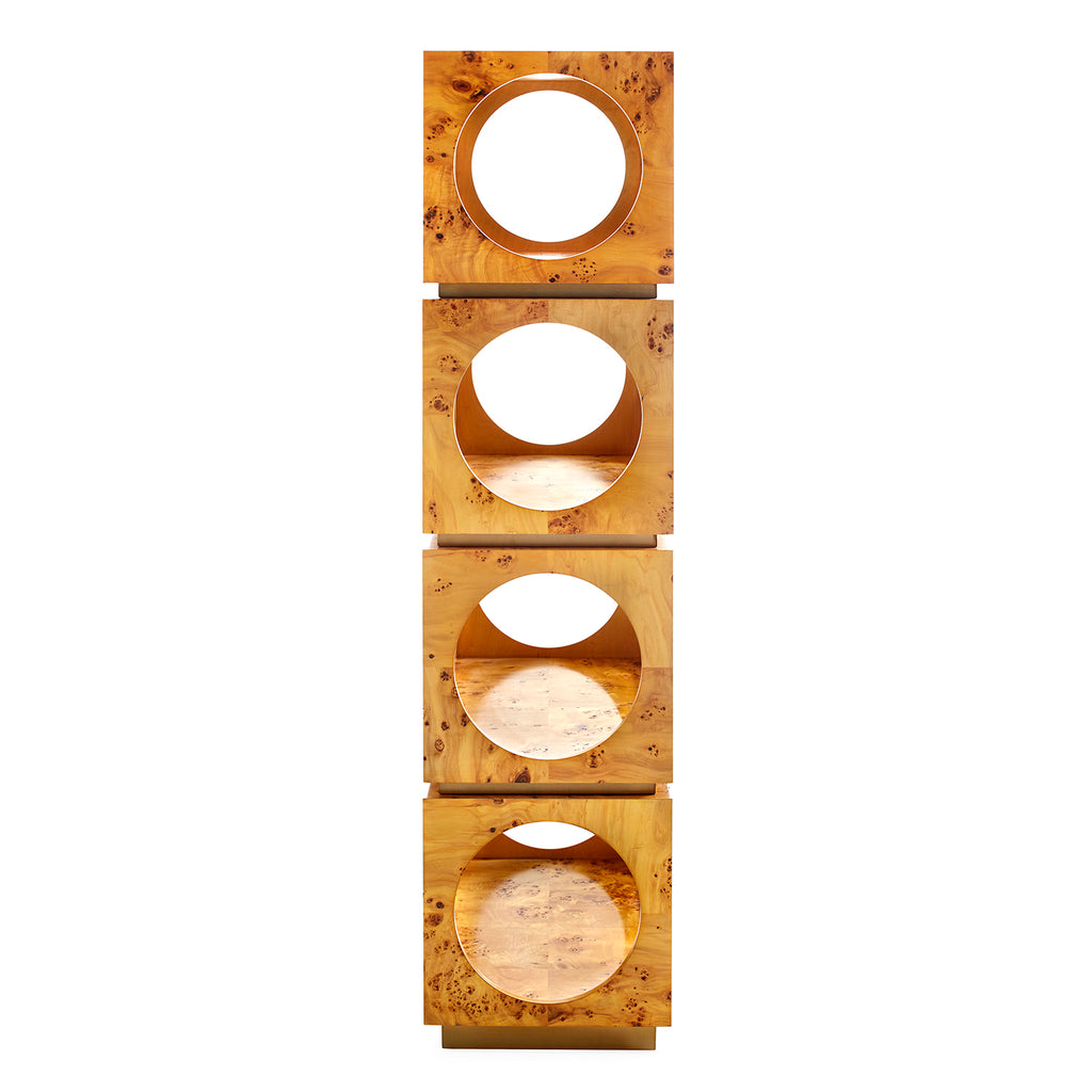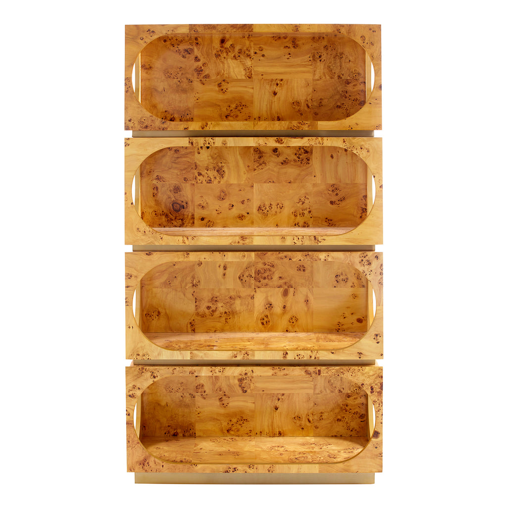 Architectural rigor meets the warmth of burled wood. The Jonathan Adler Bond Etagere features pieced mappa wood shelves with capsule-shaped cut outs in the front and circular cut outs on the sides, each with antique brass reveals. Its petite scale makes for a natural fit in any space. Perfect for piling on personal artifacts, daring décor, books and blooms. For extra credit, flank your new favorite focal point with pairs of chairs and art.