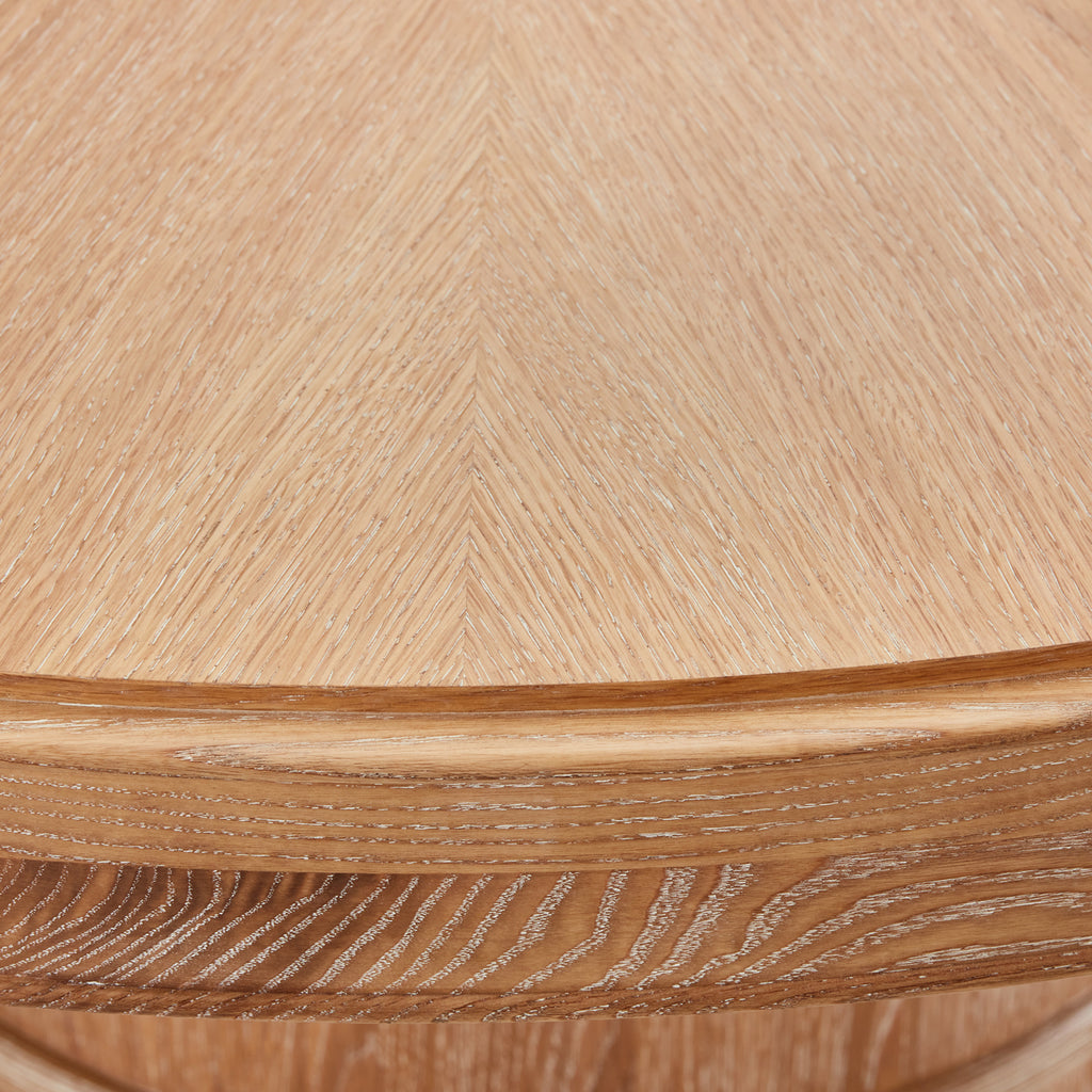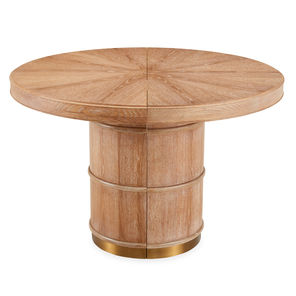 A hardworking wire-brushed and lightly limed solid oak tabletop with a radial pattern on a bamboo-inspired, brass-banded base which splits to accommodate a two-leaf expansion. Chic and timeless. Seats up to 10.
