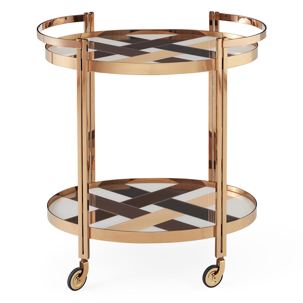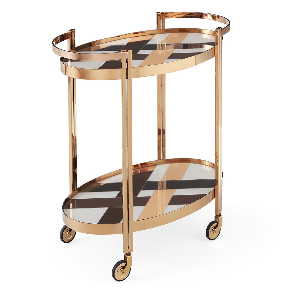 Two back painted glass shelves featuring our intoxicating Chambeige palette are set in gleaming polished brass framework. Think Halston, think Studio 54, think Egon von Fürstenberg—totally 70s, totally today. With plenty of space to deck with decanters and mixing accoutrements, our Chambeige Bar Cart is a mobile libation station that turns any corner into the swankiest spot in your abode.