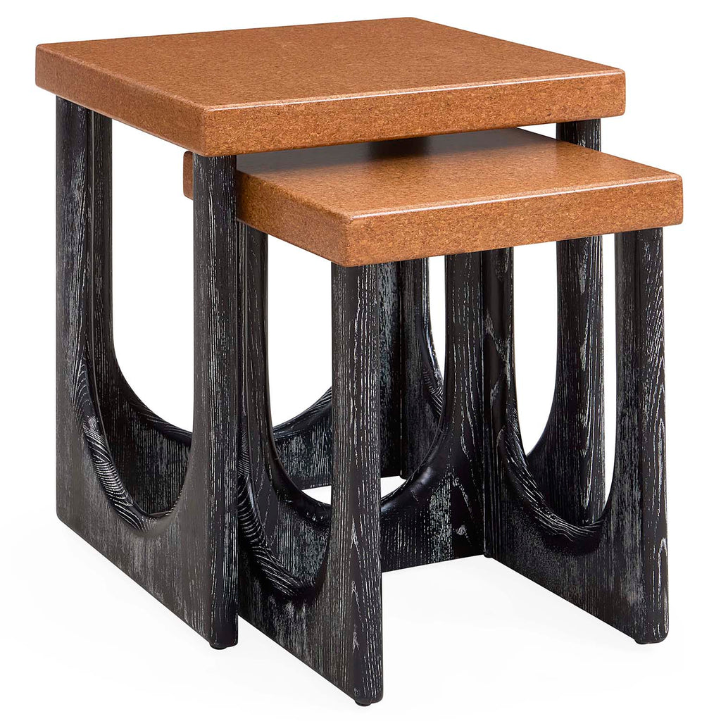Cork tabletops—organic, hardworking, surprising—perched on bases made from ebonized and wire brushed oak. Our signature arches motif offers a modern homage to the architecture of the Coliseum and to Oscar Niemeyer's Brasília. Think quiet and confident forms meet function: two sizes included to style together or apart. Slip one into place wherever you need a surface, or tuck the shorter table partially beneath its taller counterpart for a multi-layer surface.