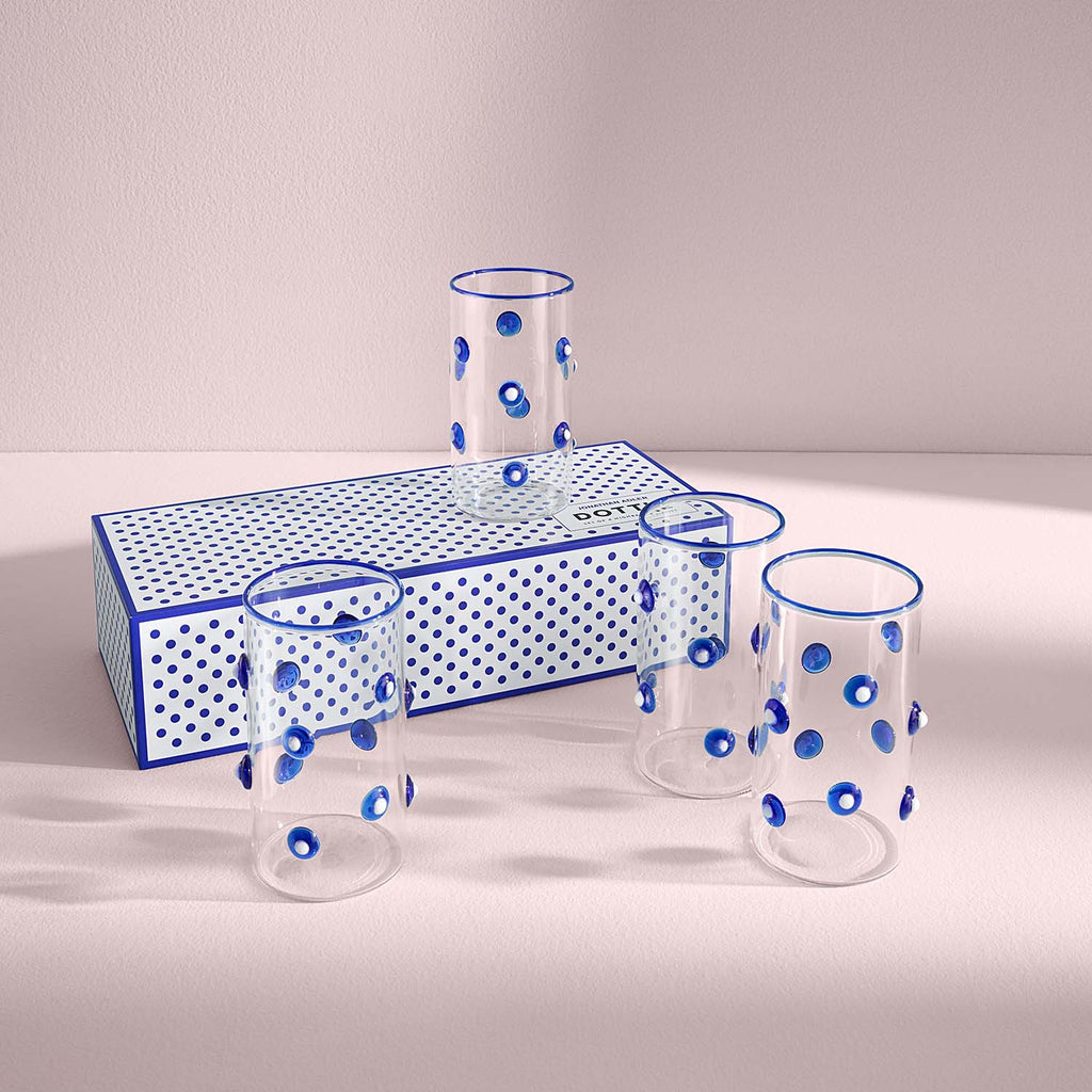 Our hand blown Dottie glassware is adorned with a pattern of bold, dimensional blue and white dots, each applied during the glassblowing process by skilled artisans. The spot of color your at-home bar needs, they're an equal treat at the table. Also available as a rocks glass set.