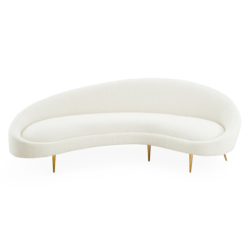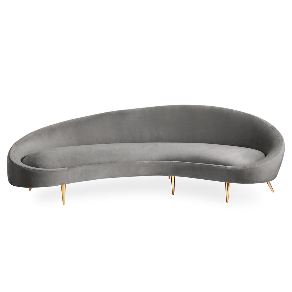 A curved sofa announces to the world that you are on the varsity decorating squad. Airy yet edgy, the Jonathan Adler Curved sofa is upholstered in heavenly azure, graphite velvet or olympus oatmeal, and perched on polished brass stiletto legs. More than a pretty seat, it's also delightfully comfortable and elegantly scaled. Float it in the middle of your living room to anchor an organic furniture plan, or let it own that corner you haven't figured out what to do with yet (it's even petite enough to pop into your bedroom corner). Always surprising, always dreamy, and always just right.