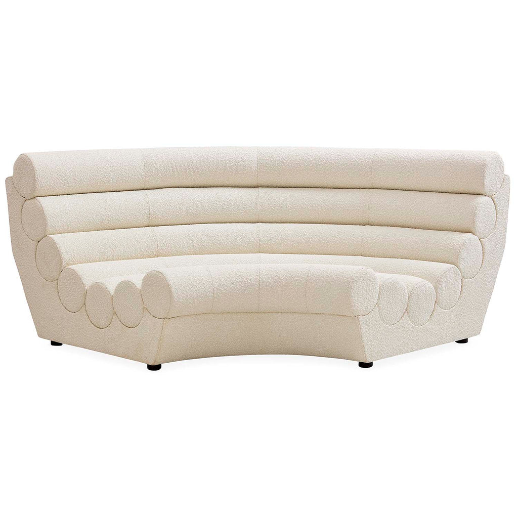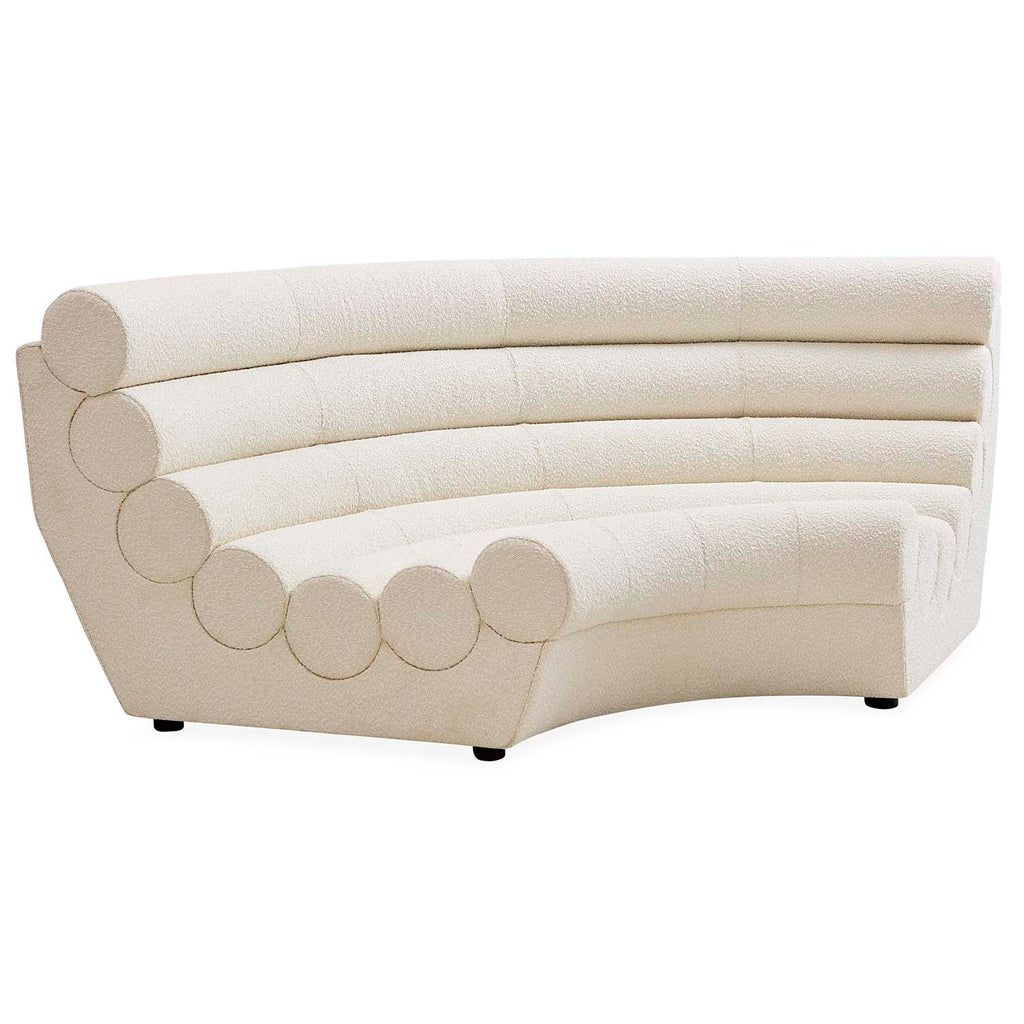 Introducing our Futura seating system. Each piece features a French 50s inspired stacked tube design—deeply channeled, ultra-futuristic, and très loungey. Firm cushions and a cradling swoop create a deep curvature that’s perfect for sinking into. Wrapped in a family-friendly white: our Vapor Ivory bouclé is contract-grade and easy to clean. Available in three and five piece configurations ready to float it in a palatial pad, or build your own with three separately sold modular pieces. Our Corner Sofa is for use as a wide corner-friendly cocoon or as a sectional joint. How our Futura seating system works: Corner Sofa + Slipper Chair + Slipper Sofa = Endless Possibilities. Join armless pieces to form modern bench-style sofas of any length. Or combine with the Corner Sofa to create give your sectional shape. Reshape as desired, or add in individual pieces to build out new configurations.