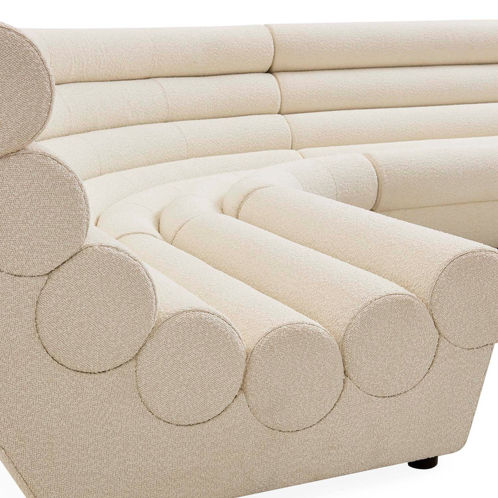 Introducing our Futura seating system. Each piece features a French 50s inspired stacked tube design—deeply channeled, ultra-futuristic, and très loungey. Firm cushions and a cradling swoop create a deep curvature that’s perfect for sinking into. Wrapped in a family-friendly white: our Vapor Ivory bouclé is contract-grade and easy to clean. Available in three and five piece configurations ready to float it in a palatial pad, or build your own with three separately sold modular pieces. How our Futura seating system works: Corner Sofa + Slipper Chair + Slipper Sofa = Endless Possibilities. Join armless pieces to form modern bench-style sofas of any length. Or combine with the Corner Sofa to create give your sectional shape. Reshape as desired, or add in individual pieces to build out new configurations.