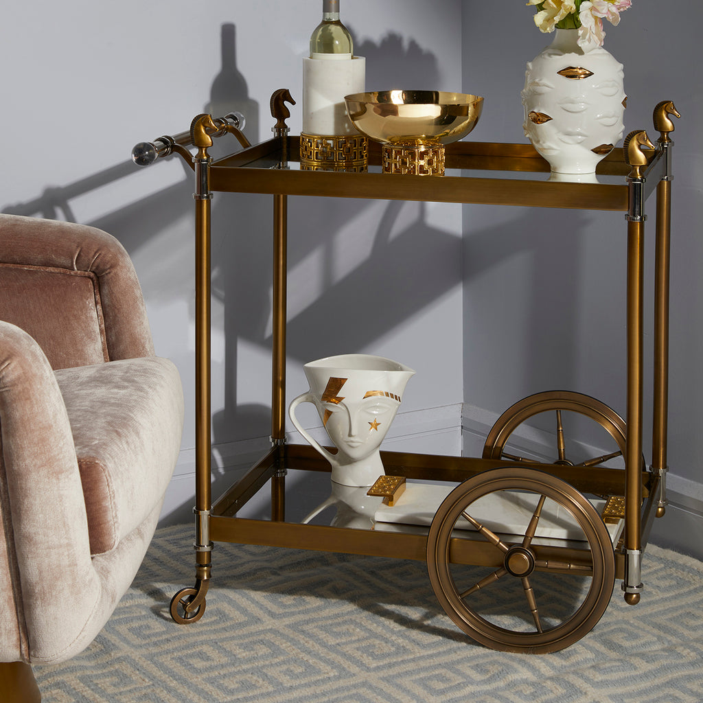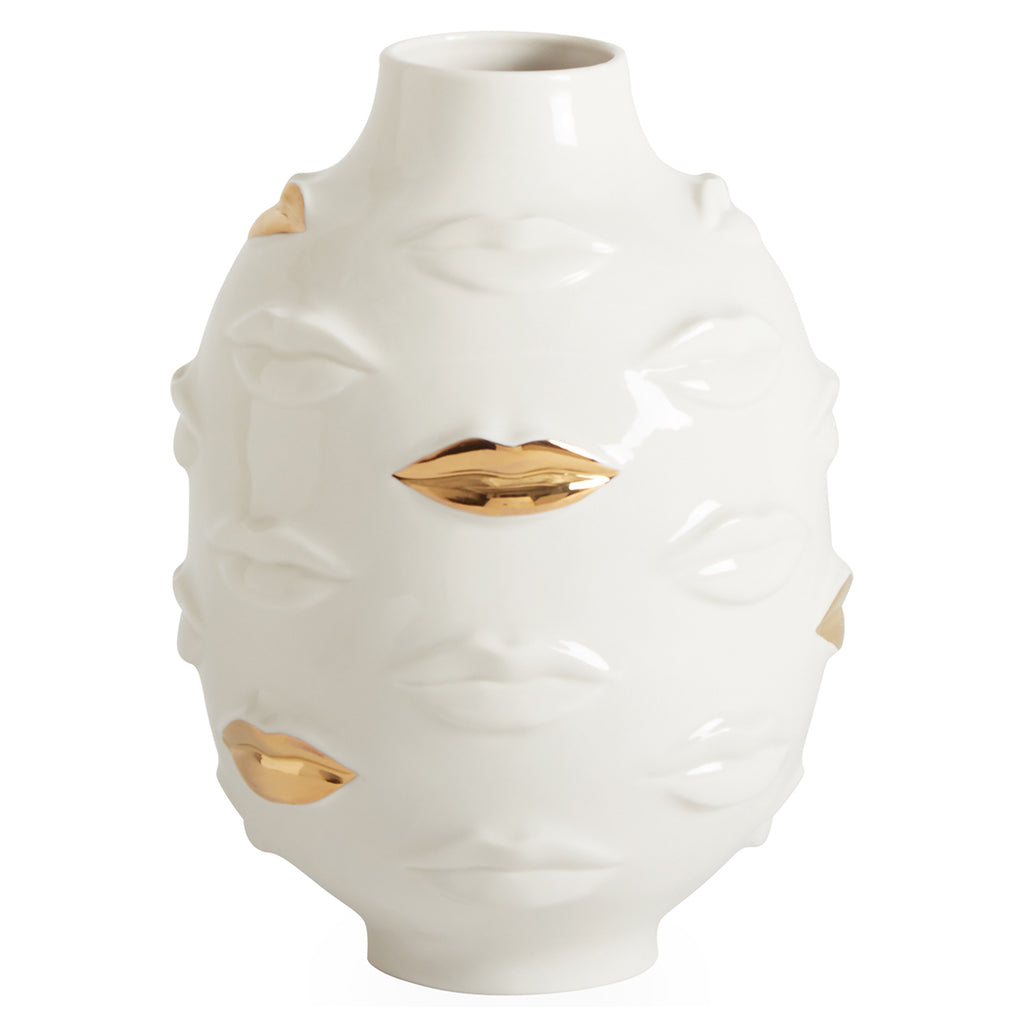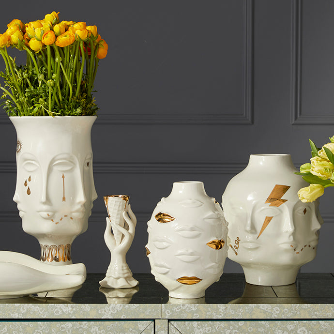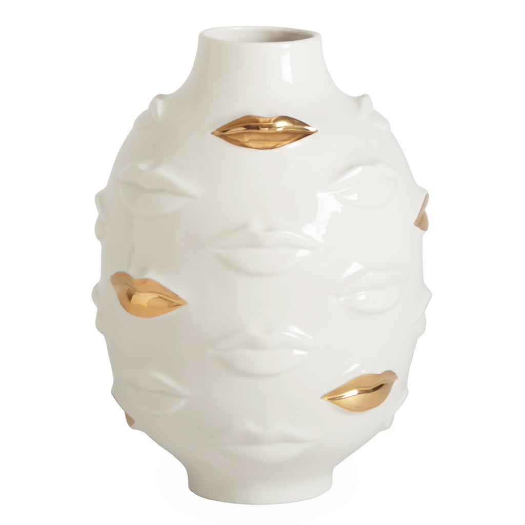 Subversive signs and symbols rendered in glittering gold adorn the glossy high fired porcelain pieces—signature favorites with the glamour cranked up to 11. Wrapped in an expressive collection of moody mouths, The Jonathan Adler Gilded Gala Round Vase is a kiss of cool for your table, mantel, or shelf. Inspired by Gala, wife and muse of Salvador Dali. Jonathan throws the models for the Muse vessels and then substitutes our signature geometric relief patterns with body parts—faces, breasts, lips—to create a surreal style.