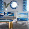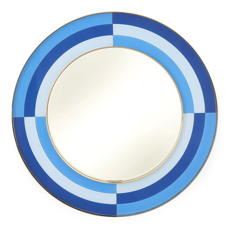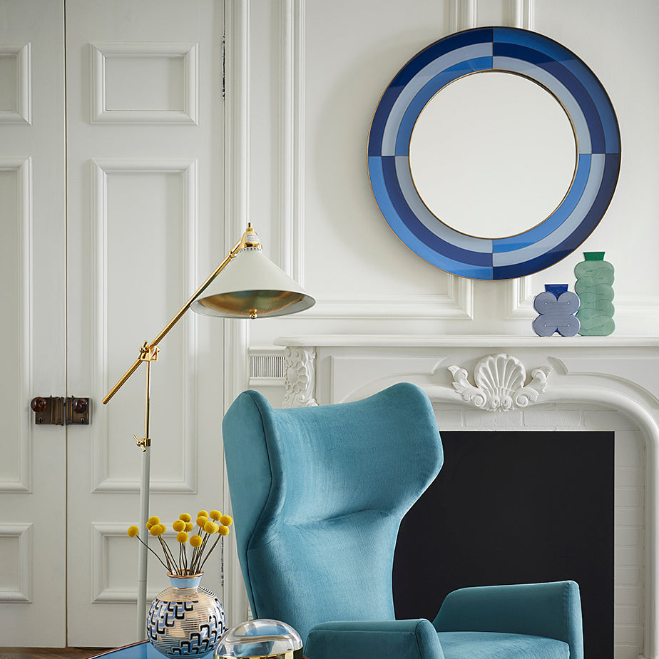 Featuring glass panes back-painted in brilliant blue hues and a generous brass frame, the Jonathan Adler Harlequin Round Mirror is a little Italian Modern, a lot of irresistible pop. Minimalist form with maximalist presence—it's fabulously futuristic in your foyer or a powerful pop in your powder room.