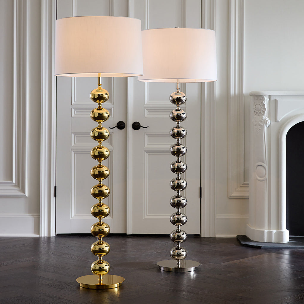 Tall and twinkly, our Hollywood Floor Lamp features a chic stack of orbs in your choice of highly reflective finishes—timeless brass or glamorous nickel. Topped with an oyster linen shade, this sparkly star lights up any room.