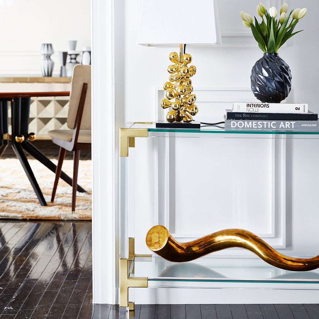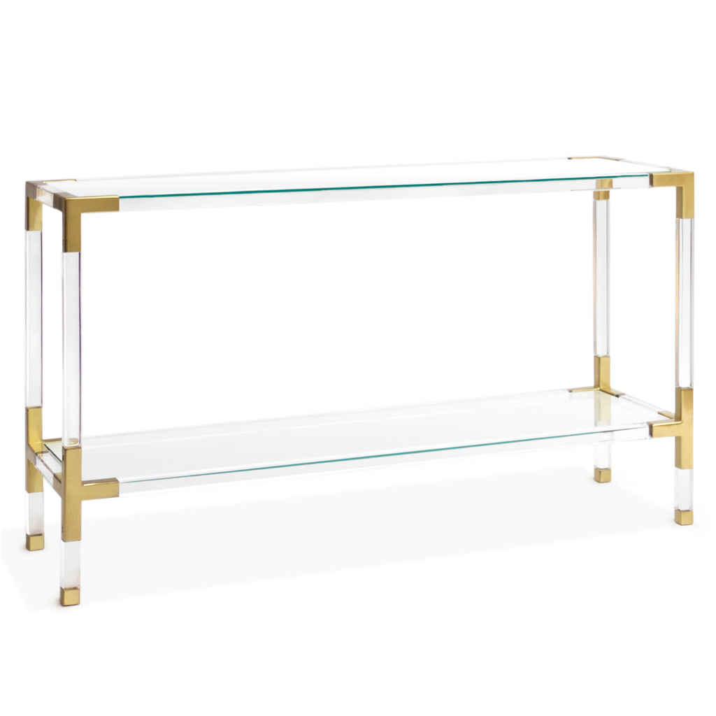The Jonathan Adler Jacques Collection is the perfect blend of simplicity and glamour, modern and traditional. Luxe clear acrylic with brushed brass, fitted with a low glass shelf for baubles or books, our Jacques Console works perfectly behind a sofa or looks fab in a foyer. Big presence, weightlessly transparent.