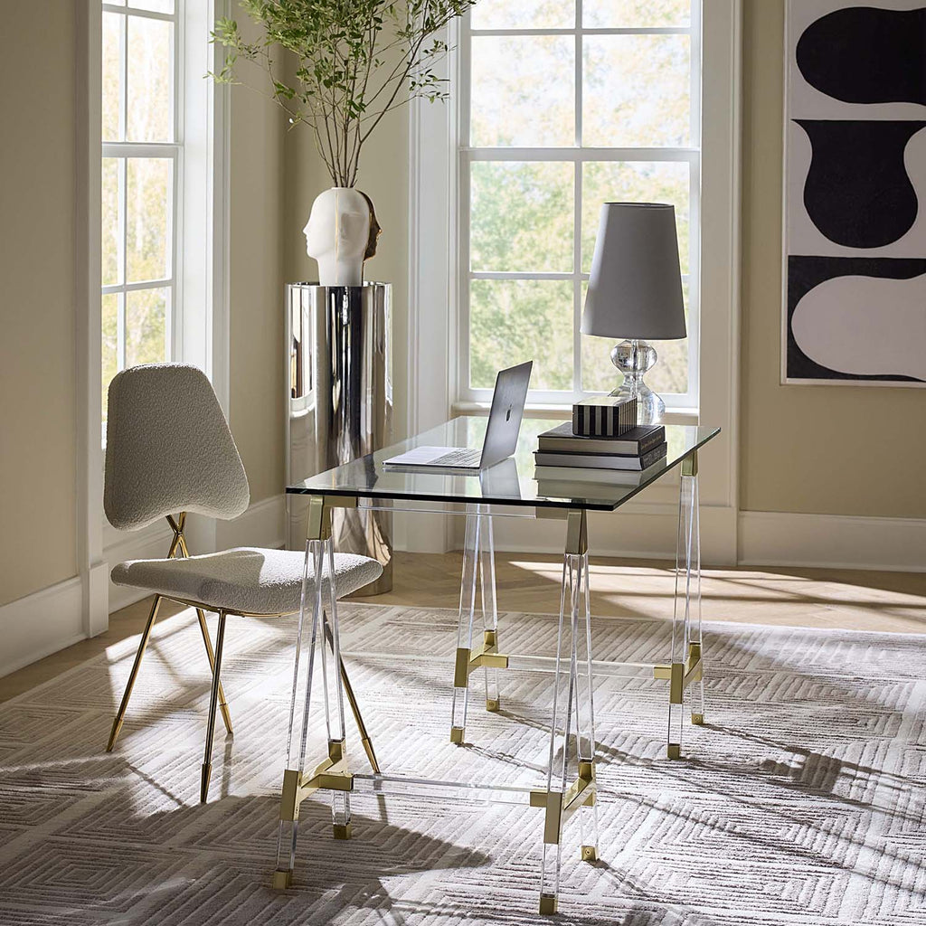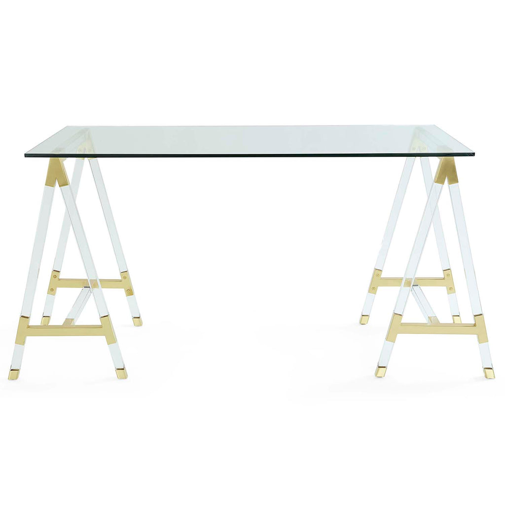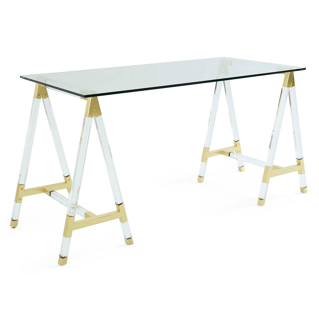 The perfect blend of modern and traditional, Our Jacques Trestle Desk is a simple yet glamorous spin on a familiar silhouette. Featuring a large tempered glass top supported by two trestle legs crafted from luxe clear acrylic with brushed brass corners. Big presence, weightlessly transparent. A natural in an architect’s airy loft, and a clear fit for any minimalist or maximalist study.
