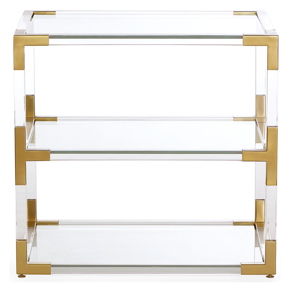 The perfect blend of simplicity and glamour, modern and traditional. At 26in high, our Jacques Two-Tier Side Table is the perfect complement for any high-armed sofa, and it doubles delightlyfully as a chic nightstand. Luxe clear acrylic, warm brass accents, and a simple silhouette work in endless interiors, from minimalist to maxilmalist. Big presence, weightlessly transparent.