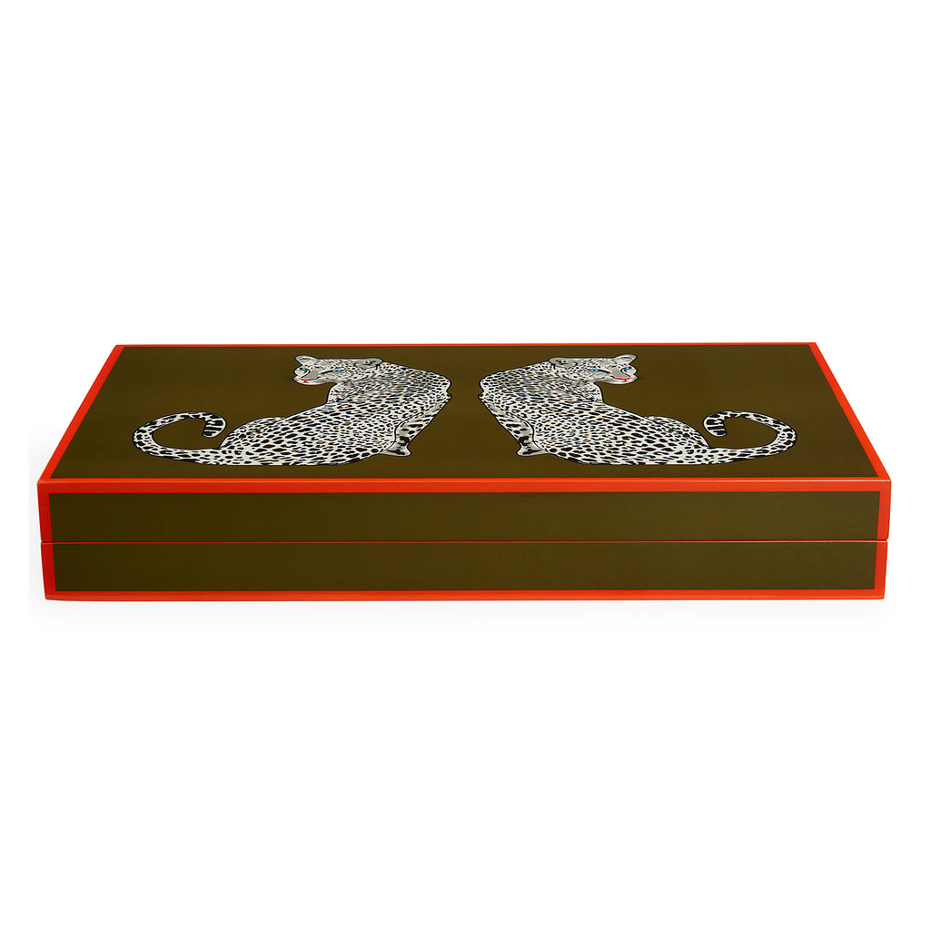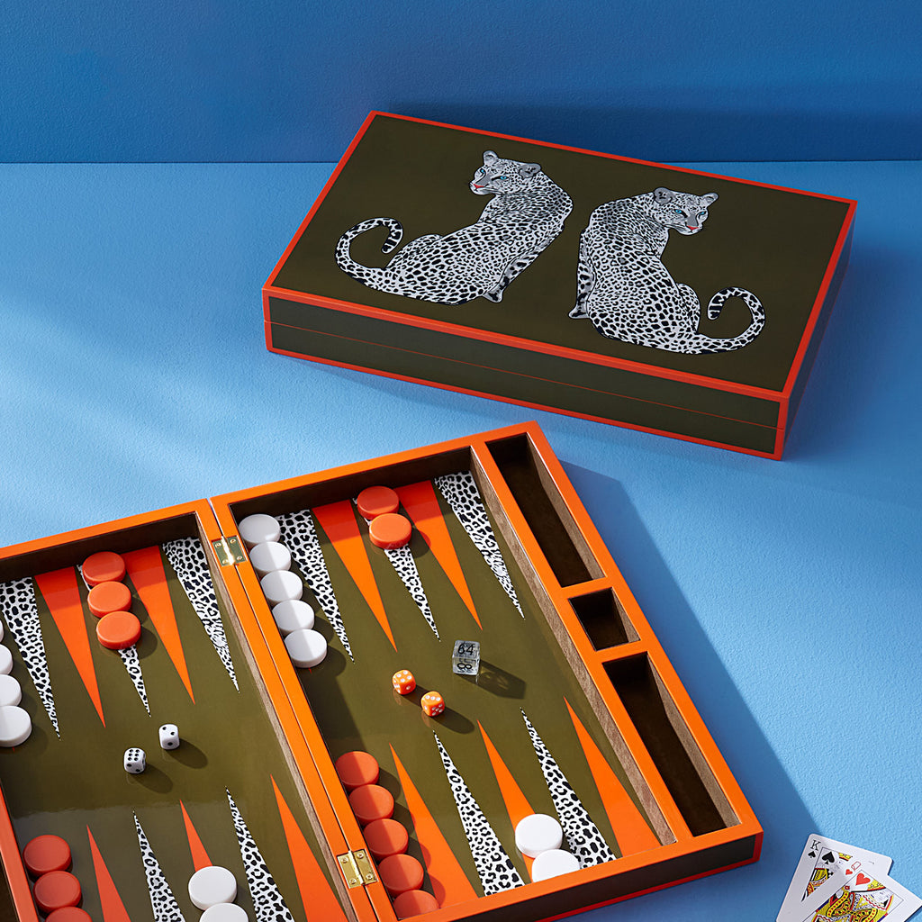 Make a play for a fiercely fabulous game night. Crafted in couture lacquer, the high-gloss box features a pair of our favorite symbol of timeless glamour—the lounging leopard. It opens to reveal a graphic interior with alternating bold orange and animal print accents. After vanquishing your foes, fold it closed for use as a chic cocktail table topper.