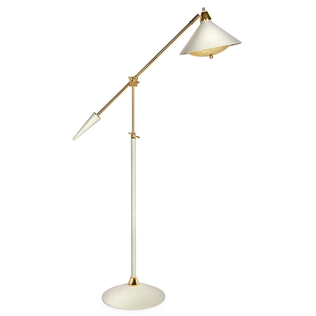 A slim, brass stem with an antique white lacquered cone base, matching shade, and signature arrow sabot. Complete with a perforated brass diffuser, our Maxime Task Floor Lamp casts a soft golden glow. Pair with your clubbiest chair and relax with your latest read.