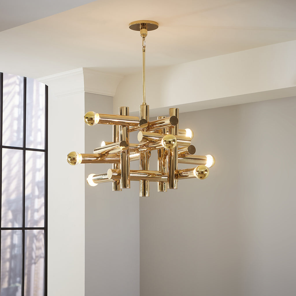 The Jonathan Adler architectural Milano Kinetic Chandelier wows with its balanced composition. Dynamic enough to catch your eye, but compactly stacked to keep it from overwhelming your space. Double down on industrial chic.