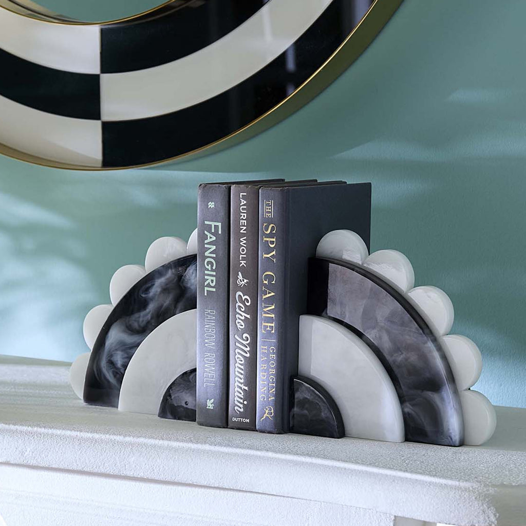 A chic and chunky scallop-edged arc to keep your tomes from toppling. Featuring our mesmerizing twist on classic black and white, our acrylic Mustique bookends pair swirling tones with Memphis-y geometrics. Each piece is hand-poured to create a unique marbleized finish, then polished by hand for a luminous shine. A modern addition to any shelf.