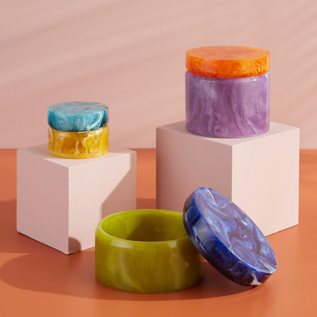 The Jonathan Adler mesmerizing Mustique collection features juicy, dimensional colors, hand-poured to create a unique marbleized finish. Each piece is then polished to luminous perfection. Each box brings one-of-a-kind shine to any modern tablescape, or style them with our Mustique vases to create a monumental moment.