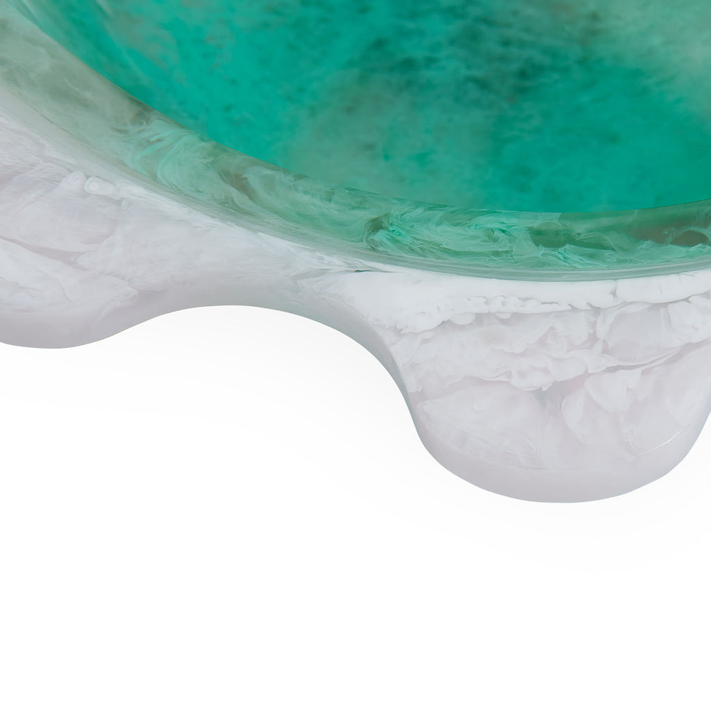 The Jonathan Adler mesmerizing Mustique collection pairs juicy, dimensional color with bold, Memphis-y geometrics. Hand-poured to create a unique marbleized finish, each piece is then polished to luminous perfection. Featuring swirling seafoam green and white ripples around the brim. One-of-a-kind shine for any modern tablescape, and even more monumental when it’s styled with the rest of the collection.