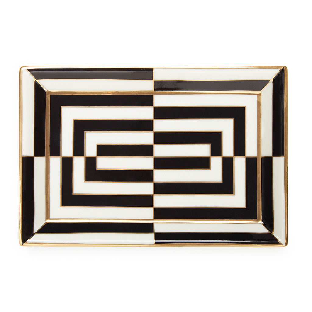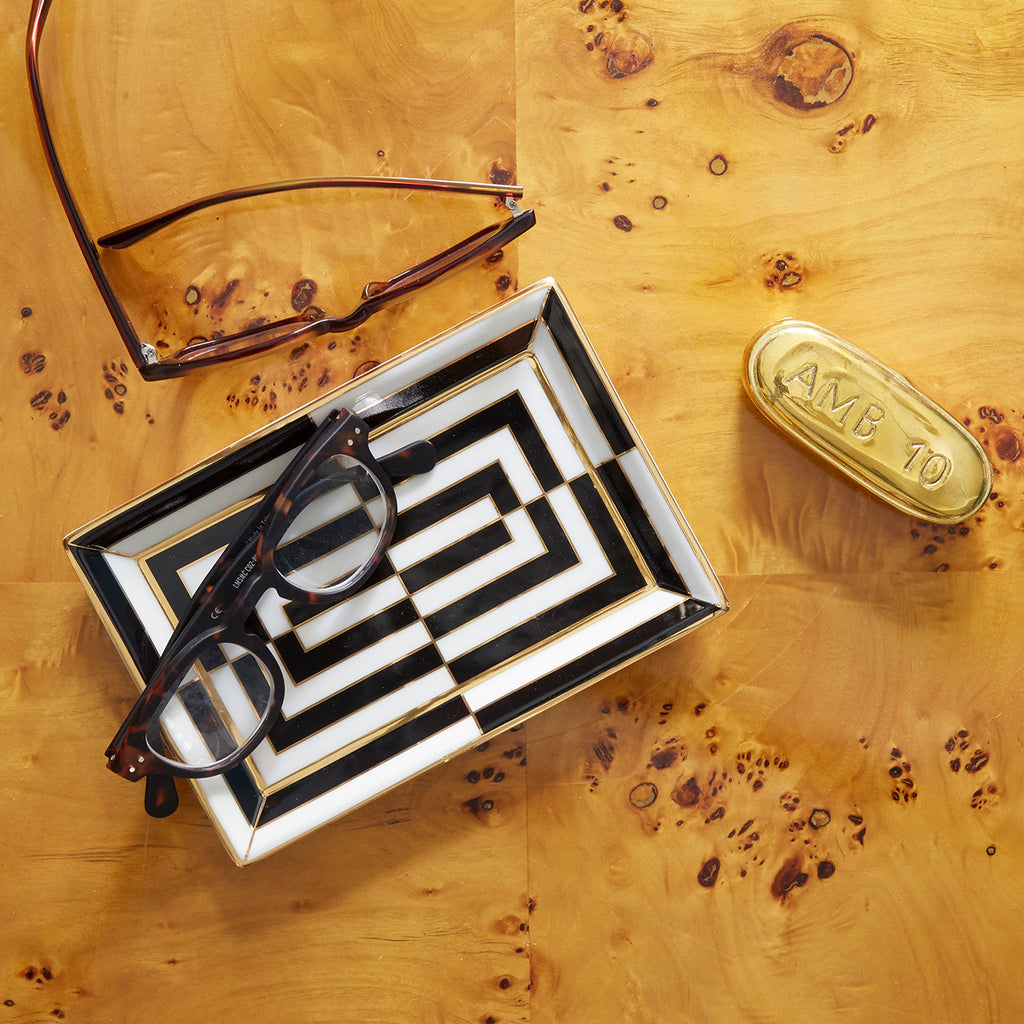 Modernist and mind-bending, the Jonathan Adler Op Art dishes and catchalls give your tablescape a gilded and graphic edge. Crafted from high-fired porcelain with solid gold accents and packaged in a nifty gift box, they make a perfect hostess present.