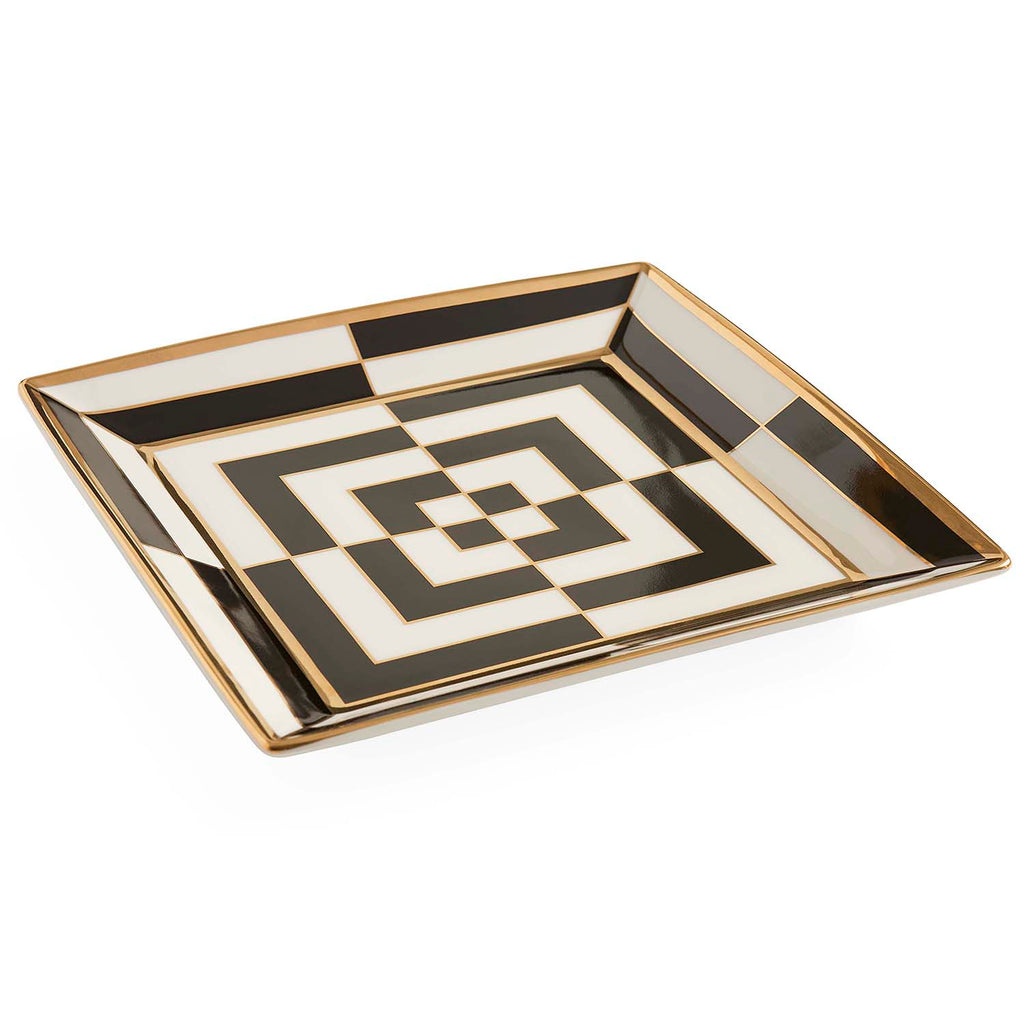 Crafted from high-fired porcelain and gilded with real gold accents for a touch of glam. Our modernist and mind-bending Op Art serveware gives your tabletop a graphic edge.