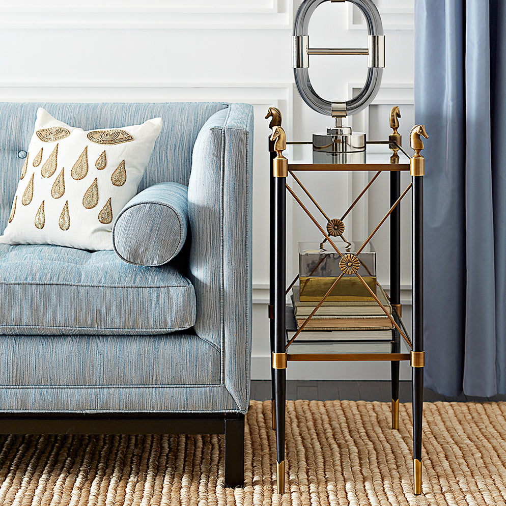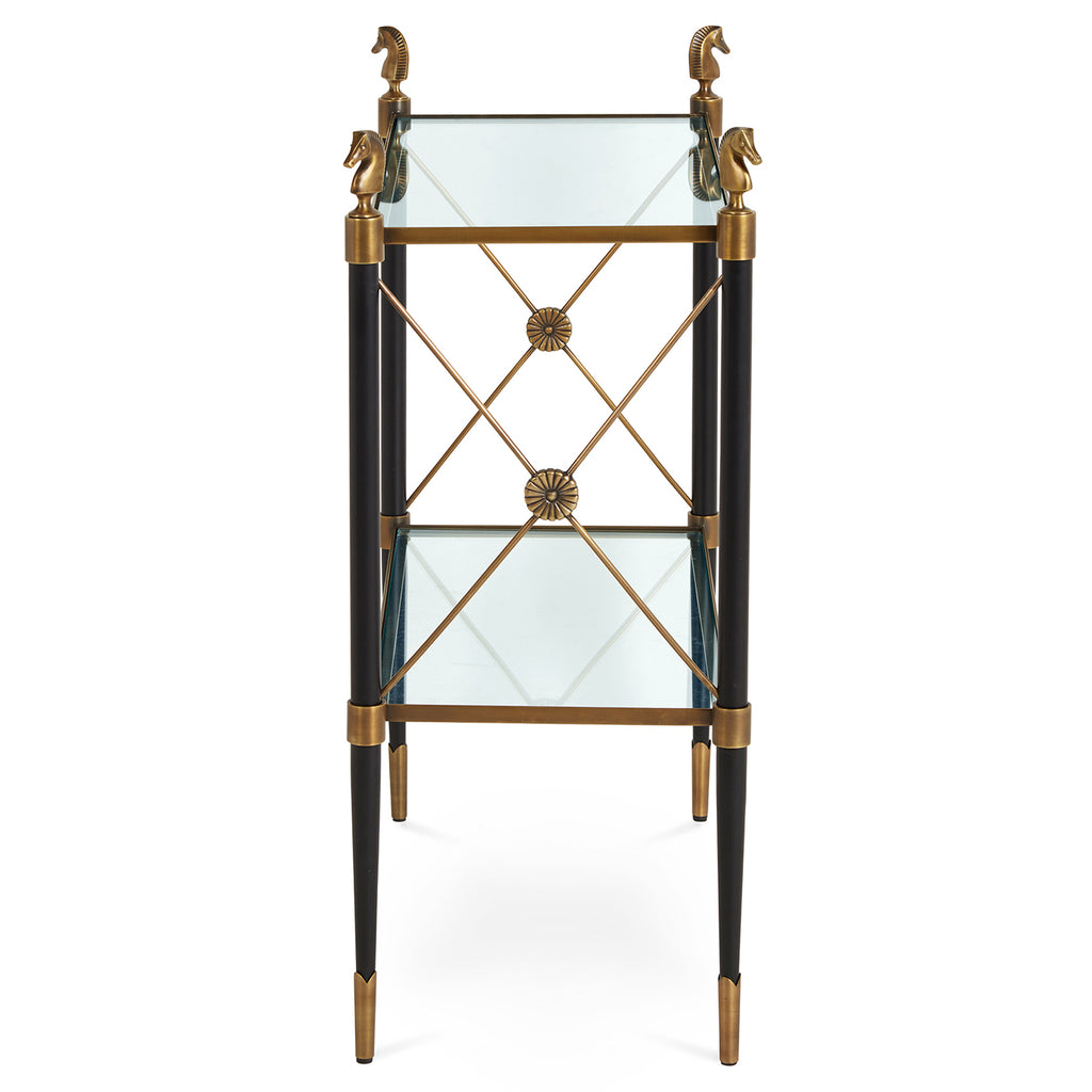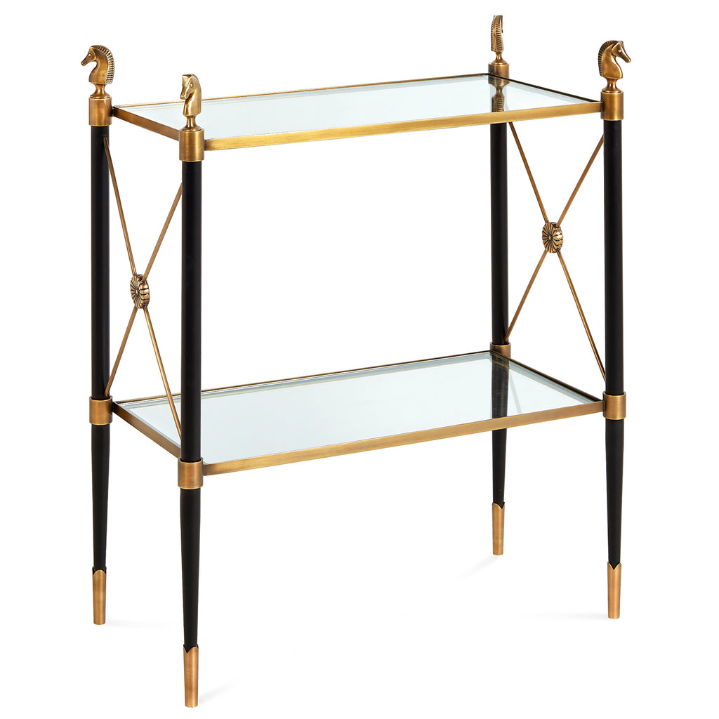 A fab storage solution for an entryway or a bathroom, the Jonathan Adler Rider Two-Tier Side Table is an updated take on French Empire style. Blackened brass legs with antiqued brass accents are capped with cast brass horse finials to create a regal vibe. The leggy base and glass shelves make this hardworking piece light and lively. Perfect as petite bookcase or next to a high-armed sofa.