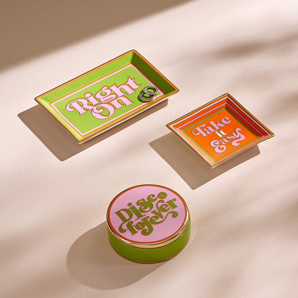 Treat your tablescape to quippy trays and catchalls from our Deep Thoughts collection. Our Right On Rectangle Tray features a profound bumper sticker sentiment rendered in couture materials with a rad retro palette. Crafted from high-fired porcelain. Packaged in a nifty gift box, it makes a perfect hostess present (or pick-me-up for yourself).