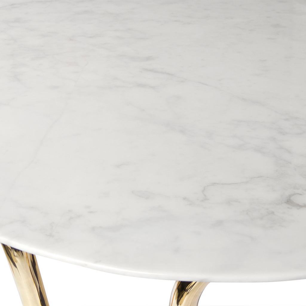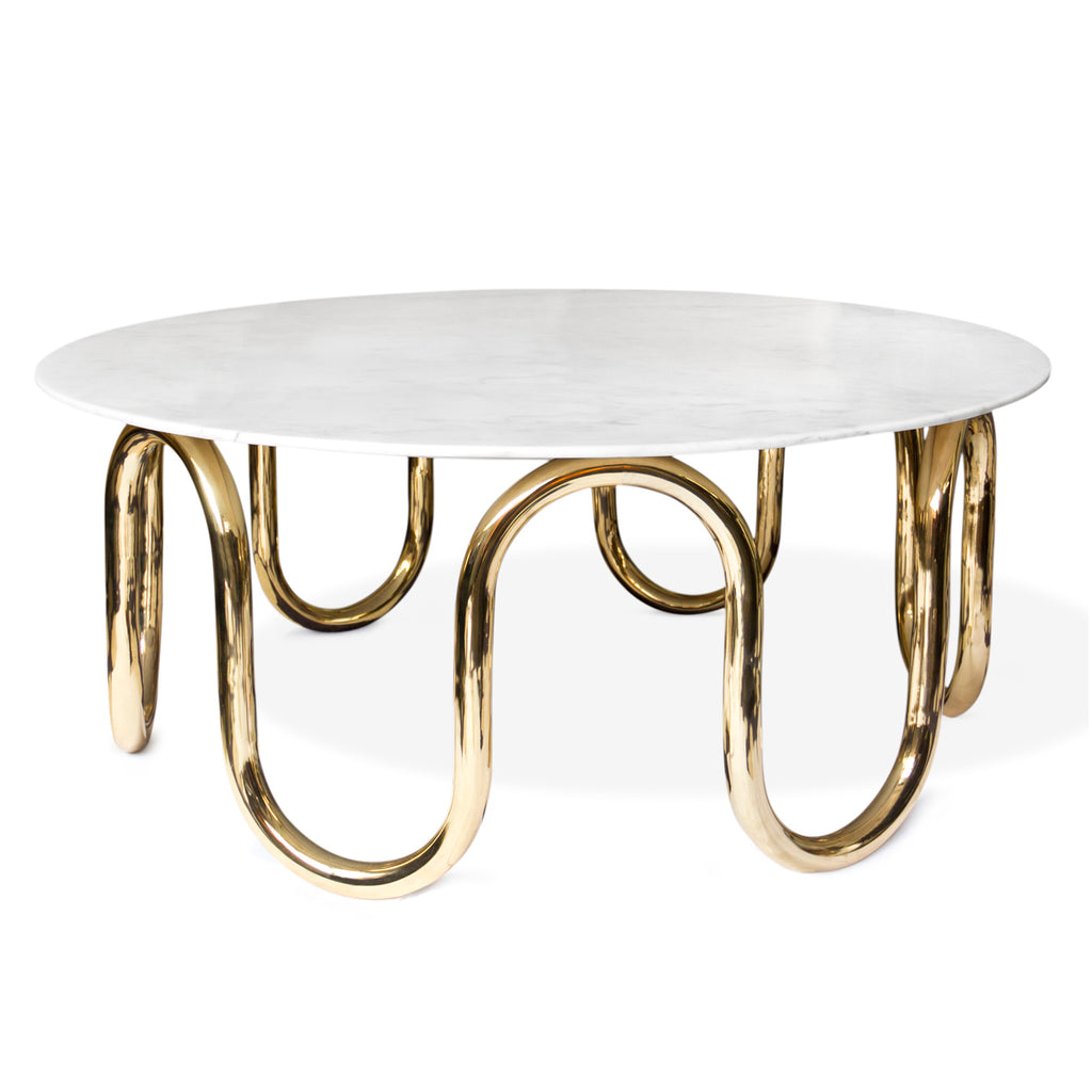 Made from a single sinuous brass tube base with a Carrara marble top. Simple form, glamorous details, memorable twinkle.