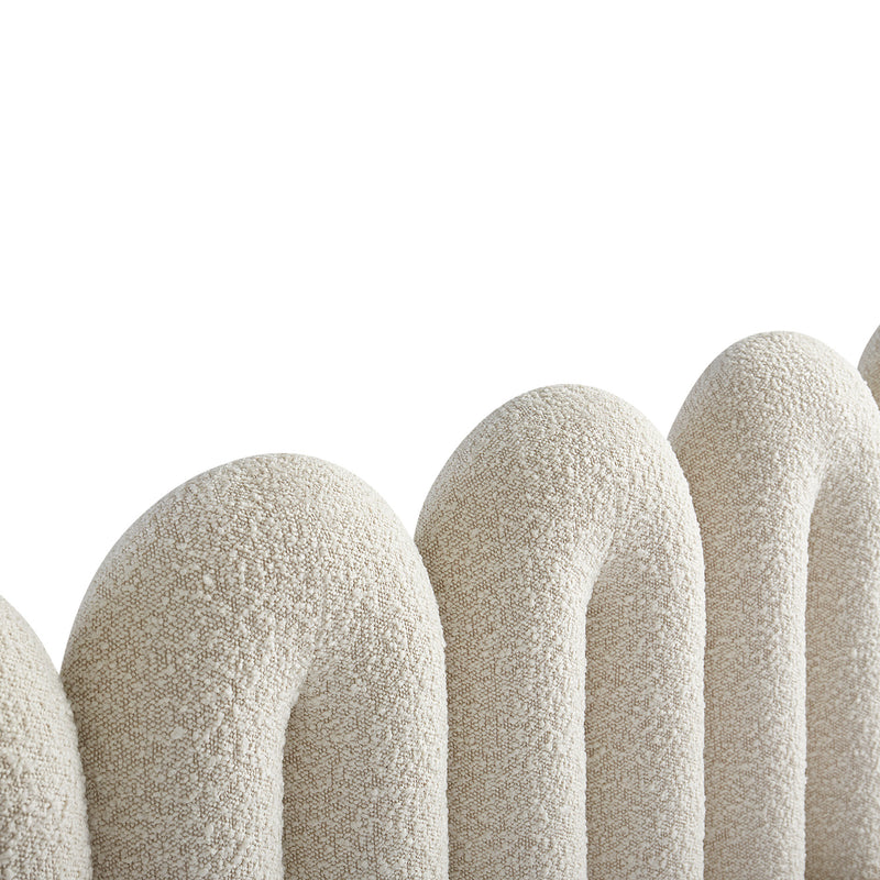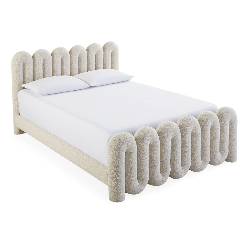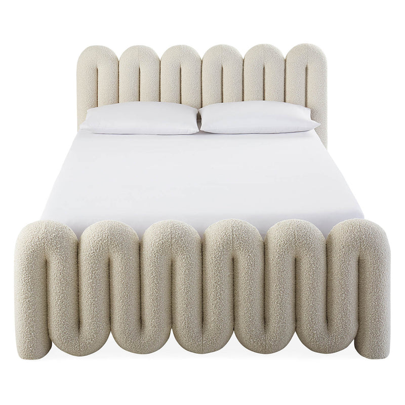 The Jonathan Adler Serpentine Bed features an ultra-mod tubular framework at the head and foot and is wrapped all the way around in our luxe yet hardworking Olympus Oatmeal bouclé—stain resistant and chic. Simple and modern but also warm and inviting, it's brilliant in a minimalist Malibu boudoir or anchoring your Tribeca loft's lair.