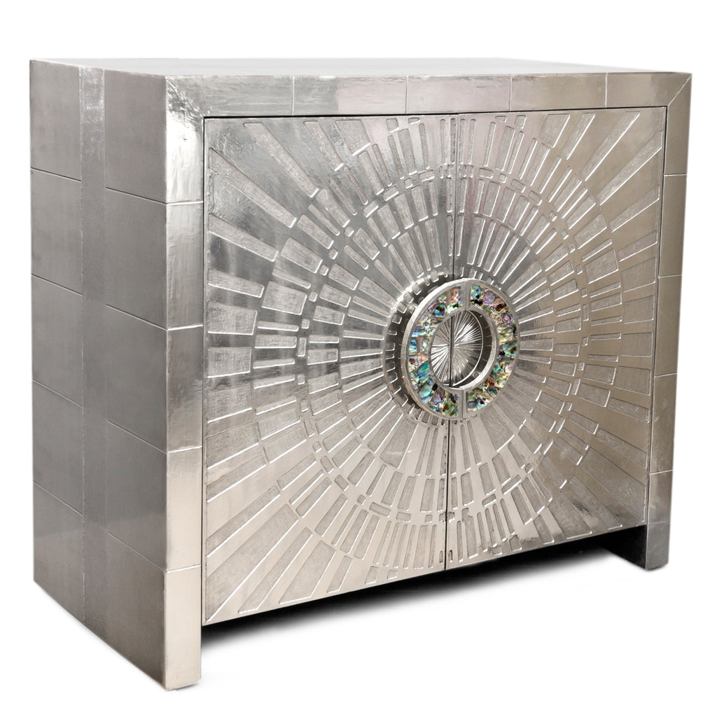 The Jonathan Adler Talitha Cabinet is jewelry for your home. An organic modern starburst pattern is capped with door pulls featuring a luminous, hand-cut abalone shell ormalachite mosaic (due to the natural material, color may vary). Crafted from nickel-plated or brass metal with hand-stamped patterns applied to minimalist, modernist forms. The surface emits a lustrous glow—but is wonderfully durable. Fab as a buffet, flanking a doorway, or as a small dresser. A warmer tone in the finish will develop over time, lacquer coating was applied to piece which will help keep the original color consistent longer.