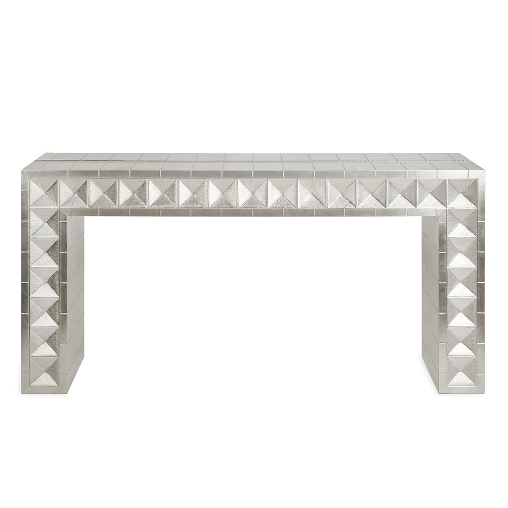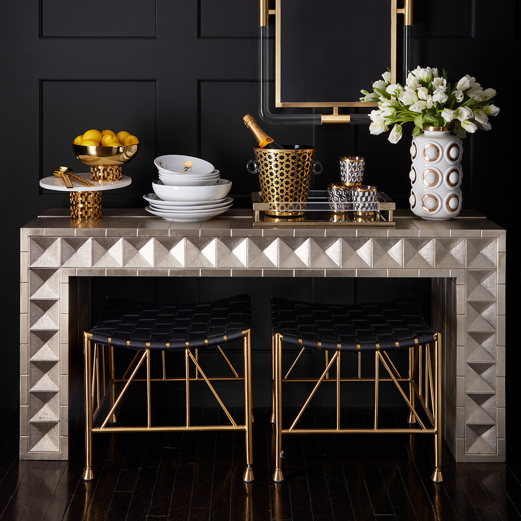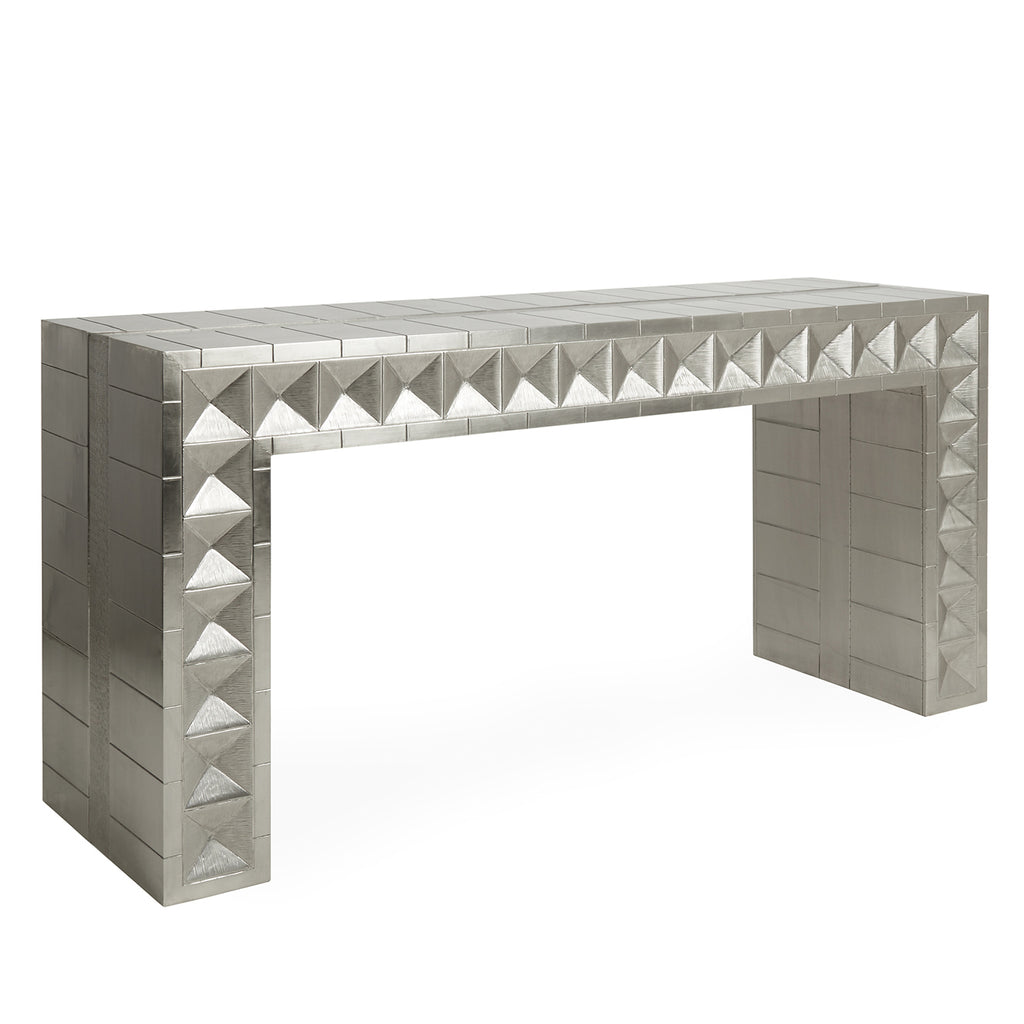 Crafted from nickel-plated metal with hand-stamped patterns applied to a minimalist, modernist form. The surface is reminiscent of silver leaf—it emits that same lustrous glow—but is wonderfully durable.