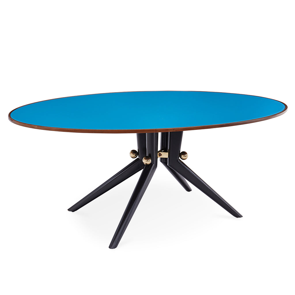 An ebonized wood base with splayed legs and solid brass spheres supports a turquoise backpainted glass top treated to a solid mahogany edge. Easily seats six to eight. Inspired by French '50s wooden warmth and durability, this is the kind of piece you fantasize about stumbling upon at Paris' Marché aux Puces. With a nod to the elegance of Italian modernism, it's hard-working enough for a family's breakfast nook.