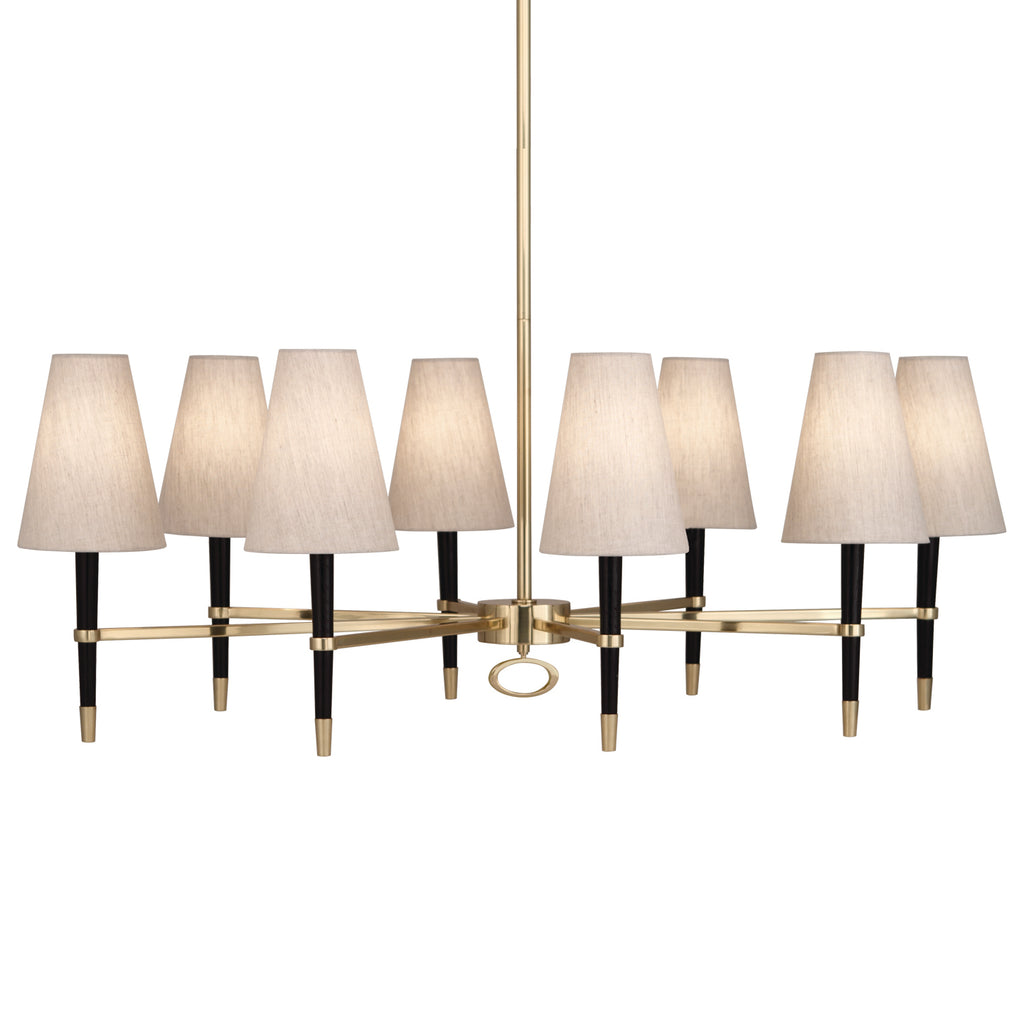 An elevated classic made from ebonized wood with antiqued brass or polished nickel accents. Our Ventana Oval Chandelier hangs handsomely with a touch of twinkle, topped with natural linen shades.