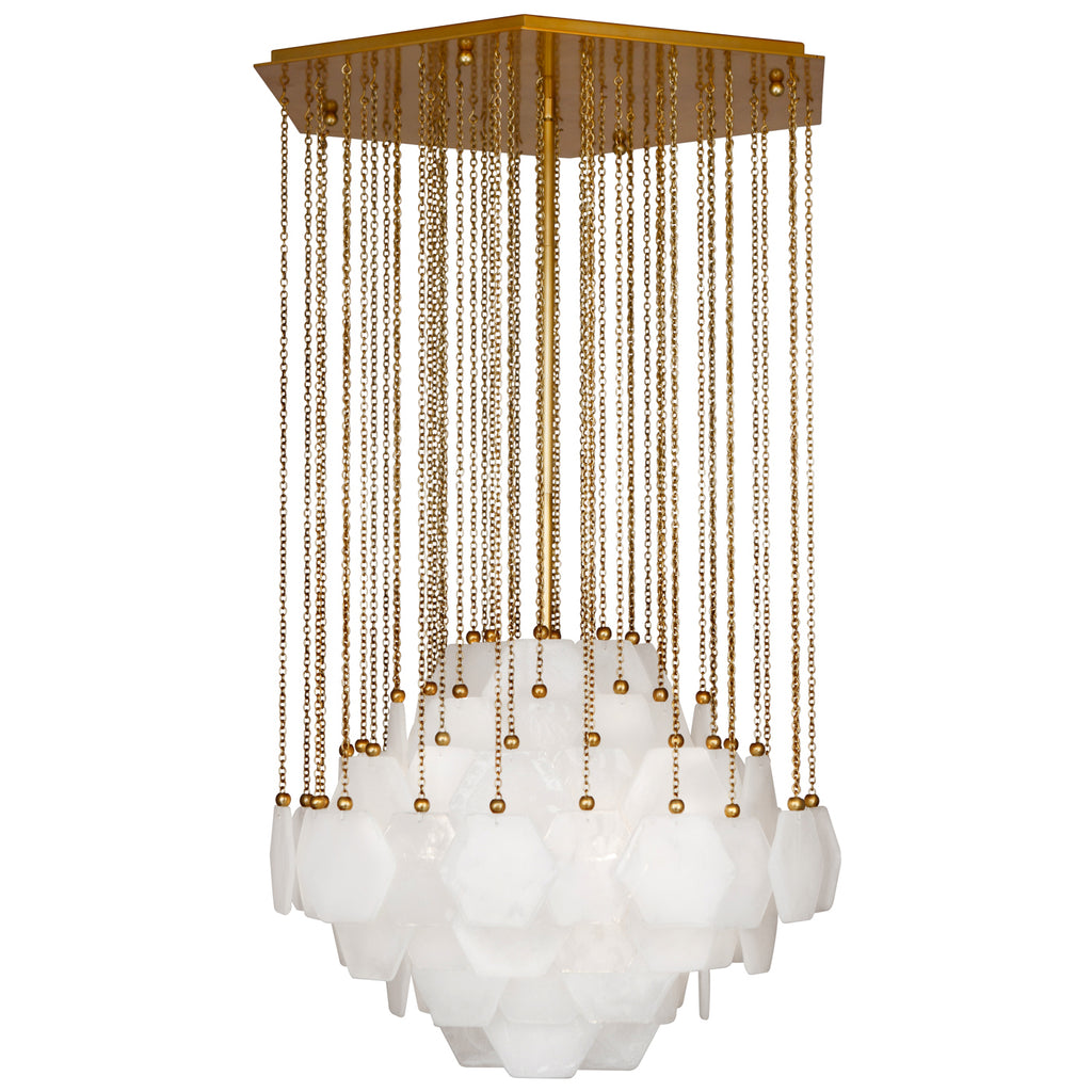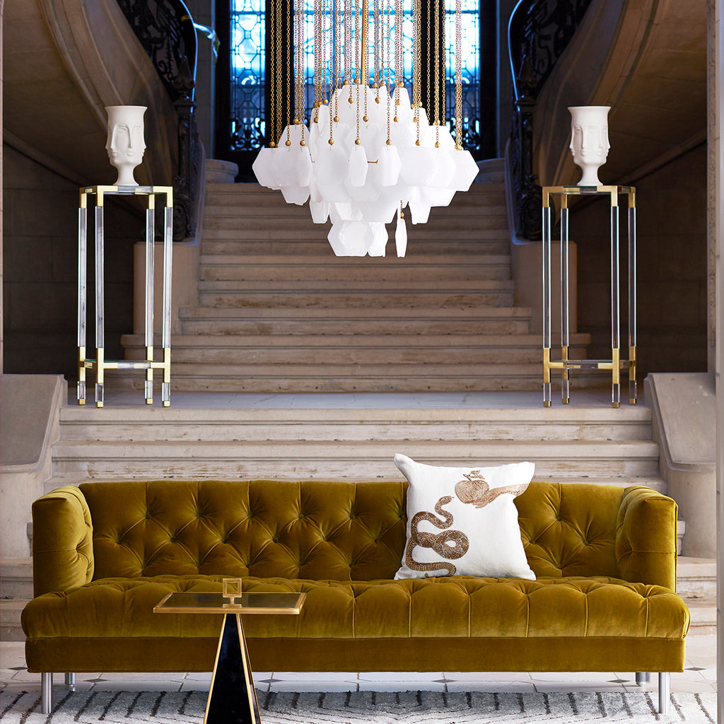 The Jonathan Adler modern homage to glamorous mid-century glass chandeliers. A myriad of 52 (small) or 88 (large) hex-shaped panels of Pulegoso* glass form a diamond shape in our Vienna Chandelier. Each piece is fixed to a metal structure with an ornamental ball.*We searched far and wide to find a workshop that uses the famous Pulegoso technique to trap air bubbles in glass for an opaque luminescence.